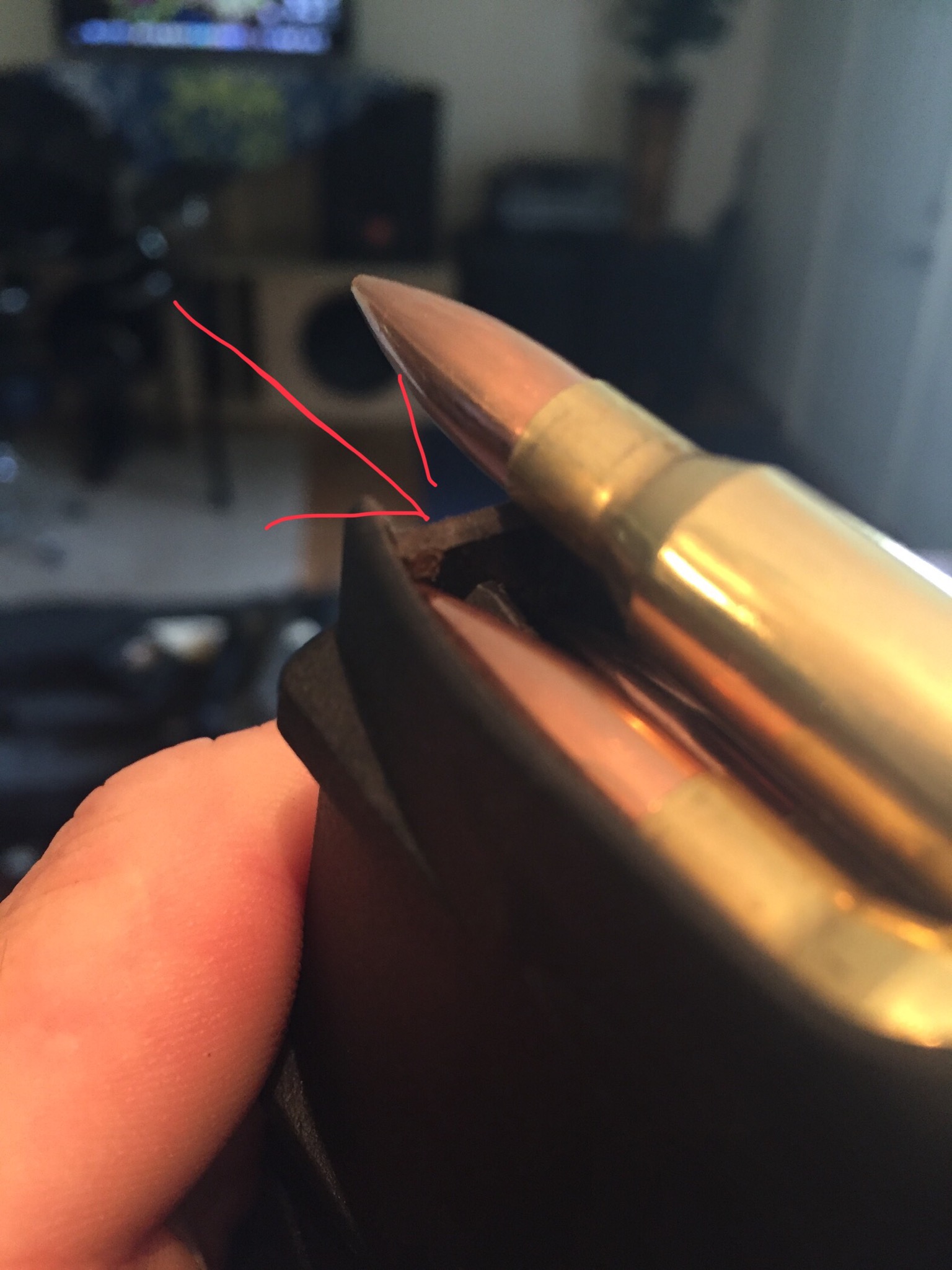 Sorry for the long intro, but now on to the issue. The gun is incredibly accurate (~ 1/2 MOA consistently with 178 ELD-X), but is having feeding issues, particularly with the first round out of the mag, and is wreaking havoc on the brass and bullet of any round that is chambered successfully. My first thought was a mag issue, but we were able to replicate the issue with 10,20,and 25 round Pmags, as well as my D&H SR-25 pattern 20 round mags (neon green follower), which I have tuned up to run smooth (corrected & polished feed lips), and the issue is present whether the mag is fully loaded, or only partially.