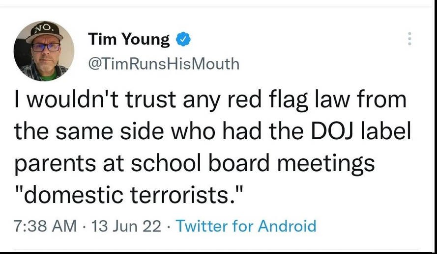 THIS! What’s to say that they won’t decide that owning x number of guns makes you a risk….. Red Flag. Didn’t get your booster shot…. conspiracy theorist so you have been flagged. On and on and on. This will be the new “swatting” sure as anything. Get doxxed by some leftist over an unpopular opinion and they turn around and flag you.