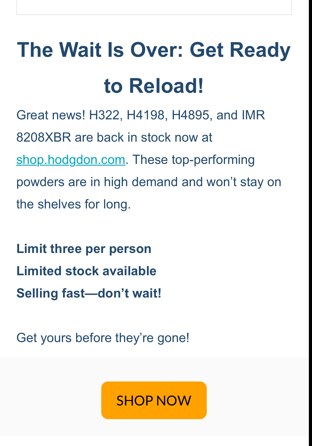 PV free hazmat today and 10% off code (post 5764). 8208 and Varget only in ($$) 1 lb, bottles but H4350 still in 8lbs jugs....