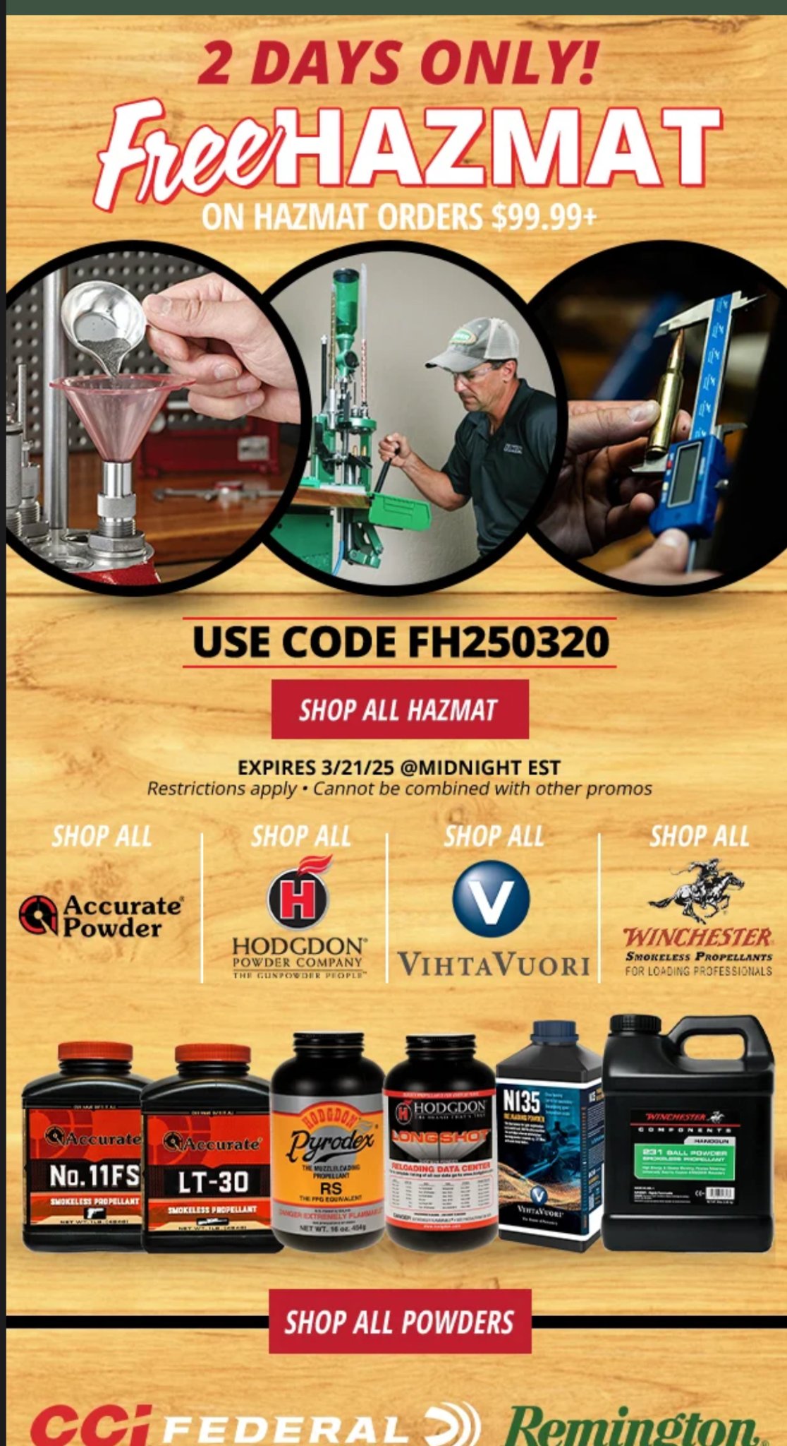 Graf has a running free haz/free shipping deal if $250 of NON CLEARANCE reloading stuff in order.