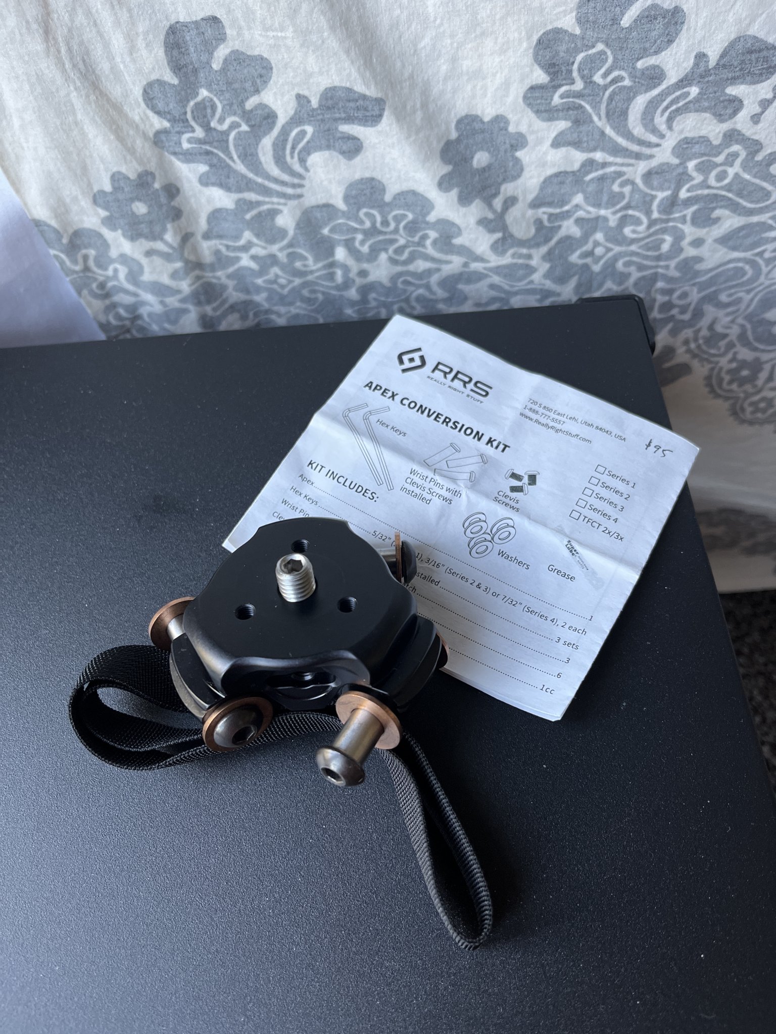 •Really Right Stuff apex fixed conversion kit, wrist pins, screws/washers included.(convert your Versa apex/platform into the smaller Fixed apex/platform) $70 shipped