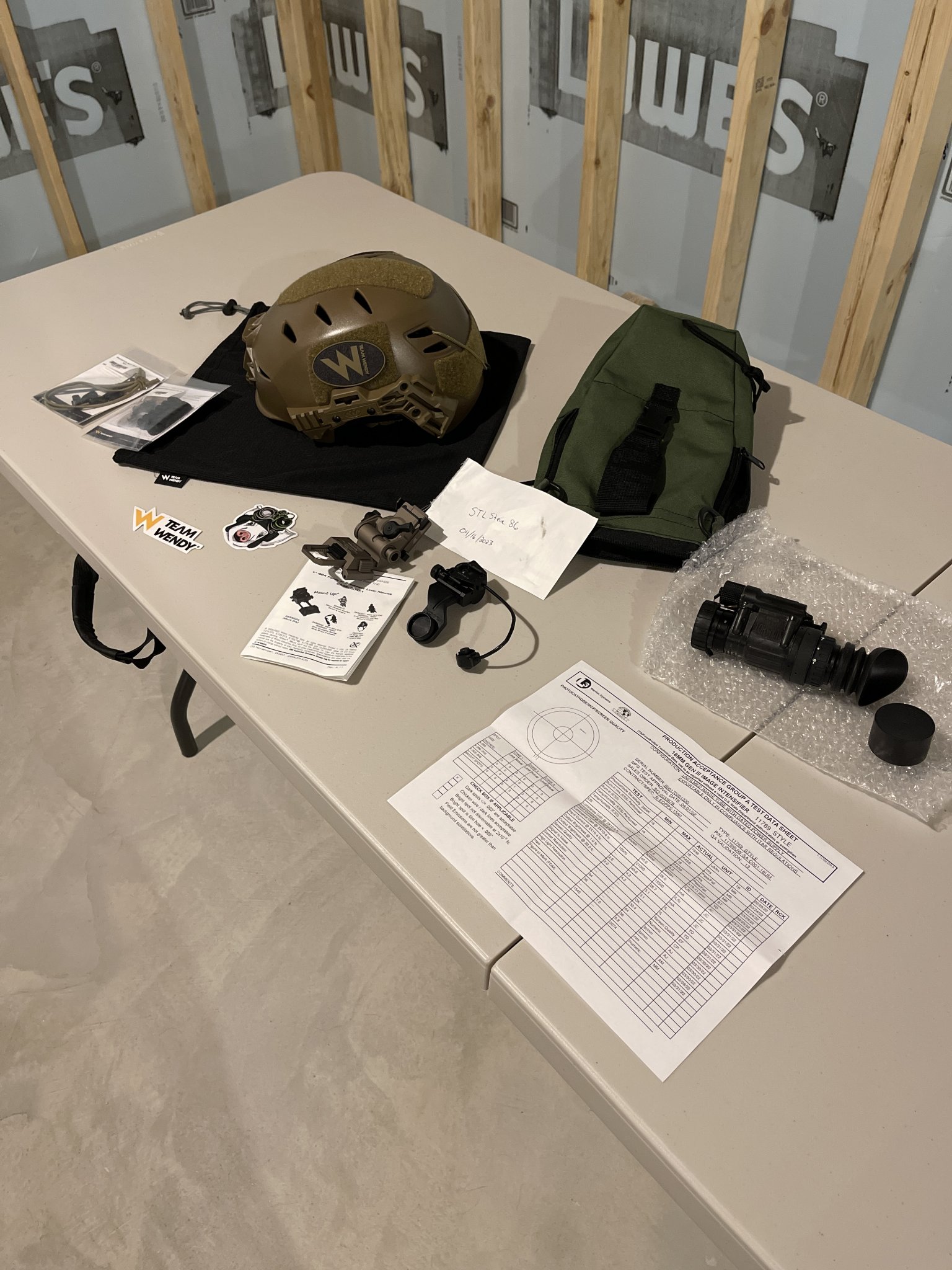 Pvs-14 wp filmless, G24, j-arm, team wendy helmet. Stepped into night vision. Bought new from sureshot last fall. Powered on a few times. Can be sold as a package or separate after optics is sold. Always stored with the battery out in low humidity gun room.