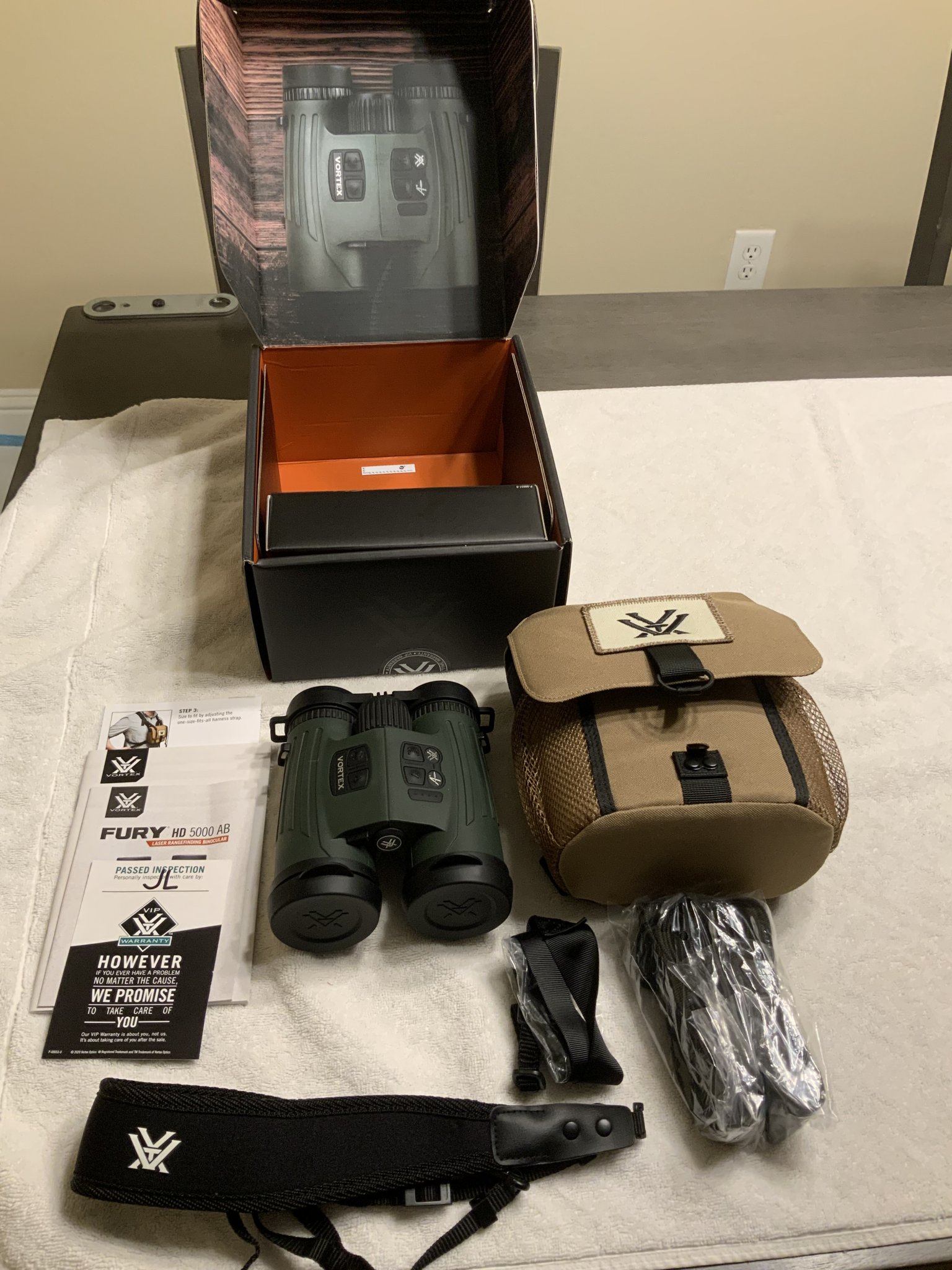 I have a pair of LNIB 10 x 42 Vortex FURY HD 5000 LRF with AB, box, accessories and all paperwork. Furthermore, it will come with the Vortex Pro Binocular Adapter with ARCA for Tripod mounting. The package includes;