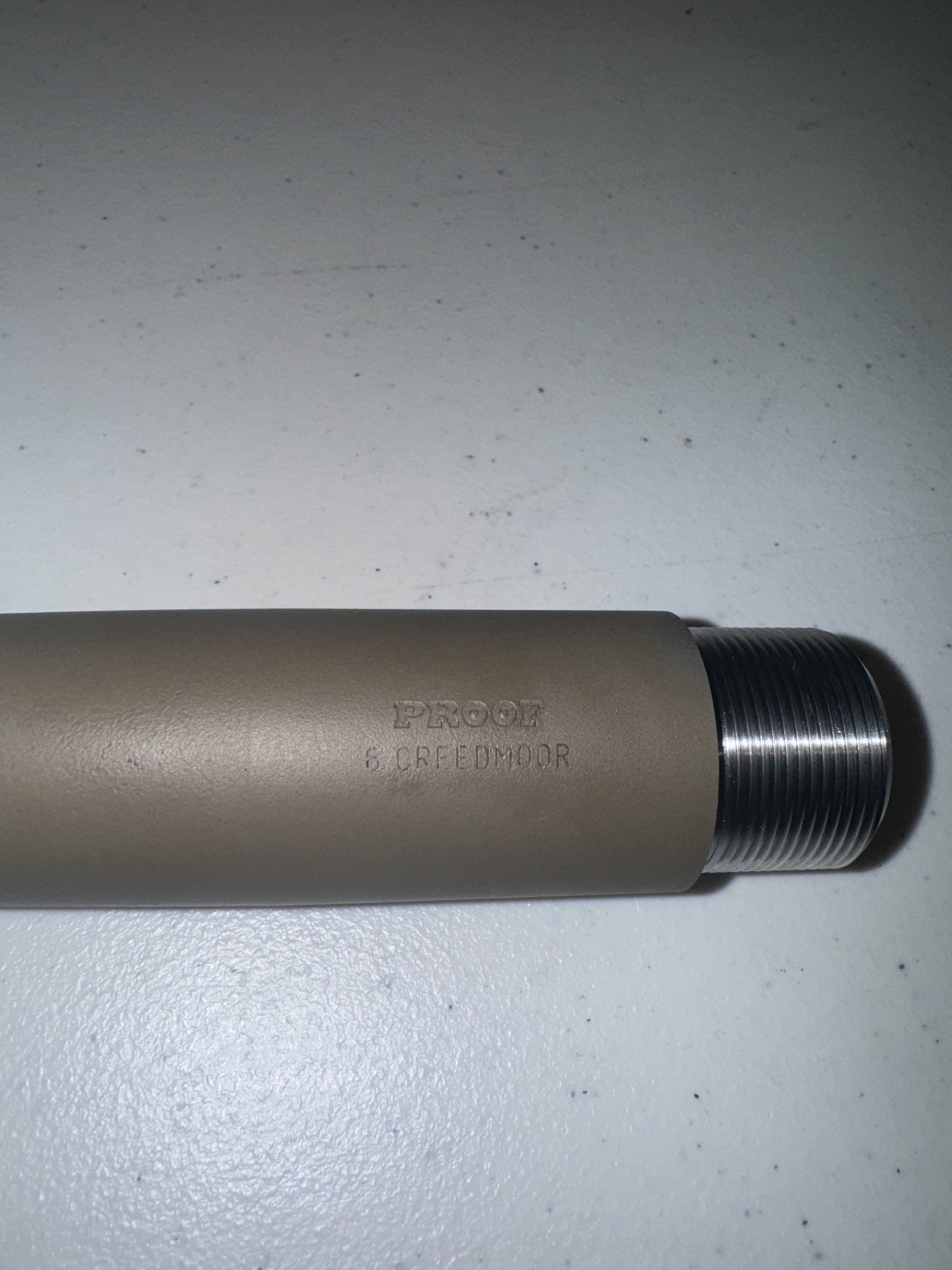 Proof Research Carbon Fiber Prefit 22 inch 6mm Creedmoor 1:7.5 twist barrel. 405 documented rounds on barrel. Proof Research’s recommended barrel break in procedure was followed during barrel break in. Only cleaning chemicals used were Boretech Eliminator, Wipe-Out foam bore cleaner, and 99% isopropyl alcohol.
