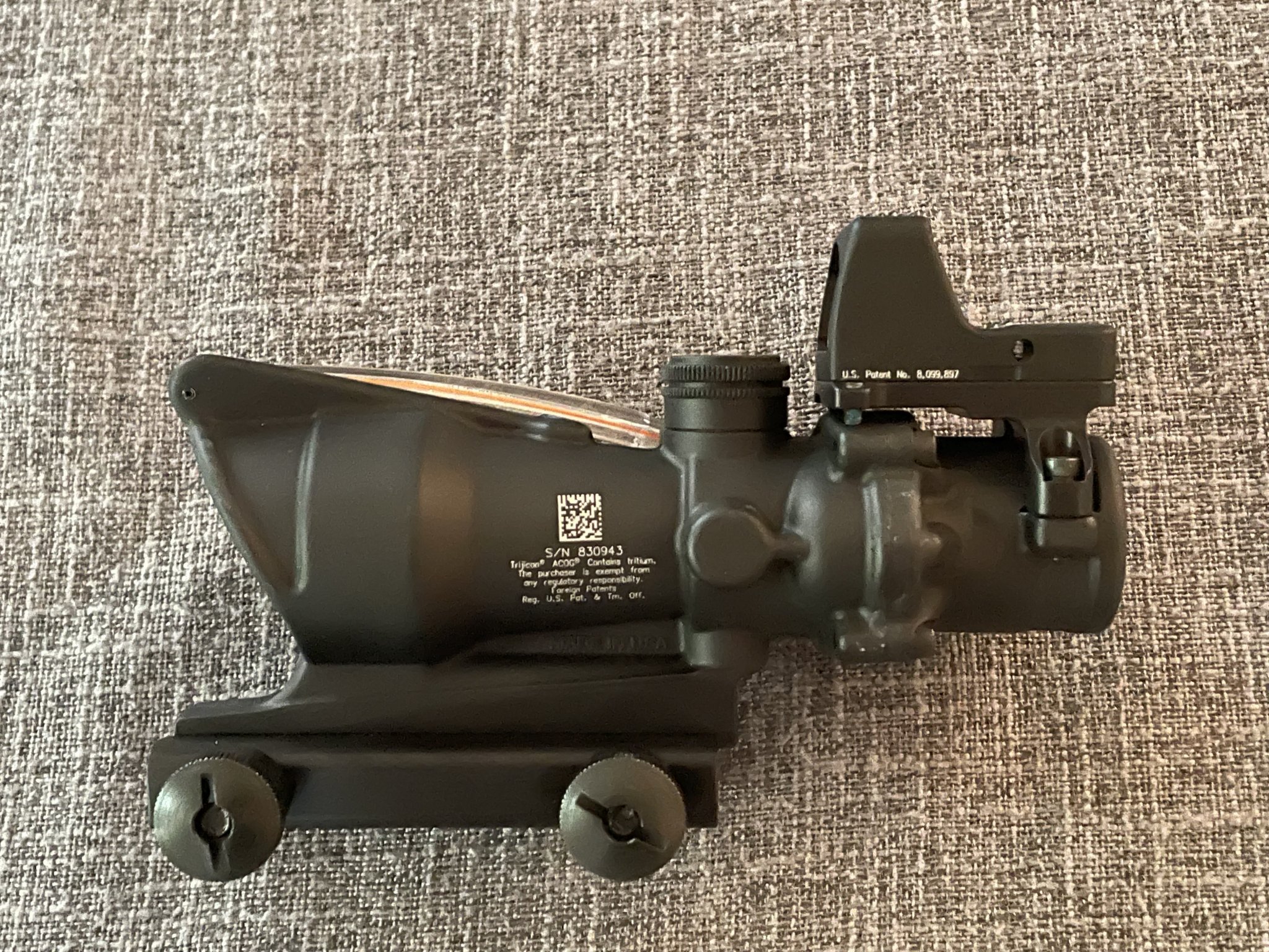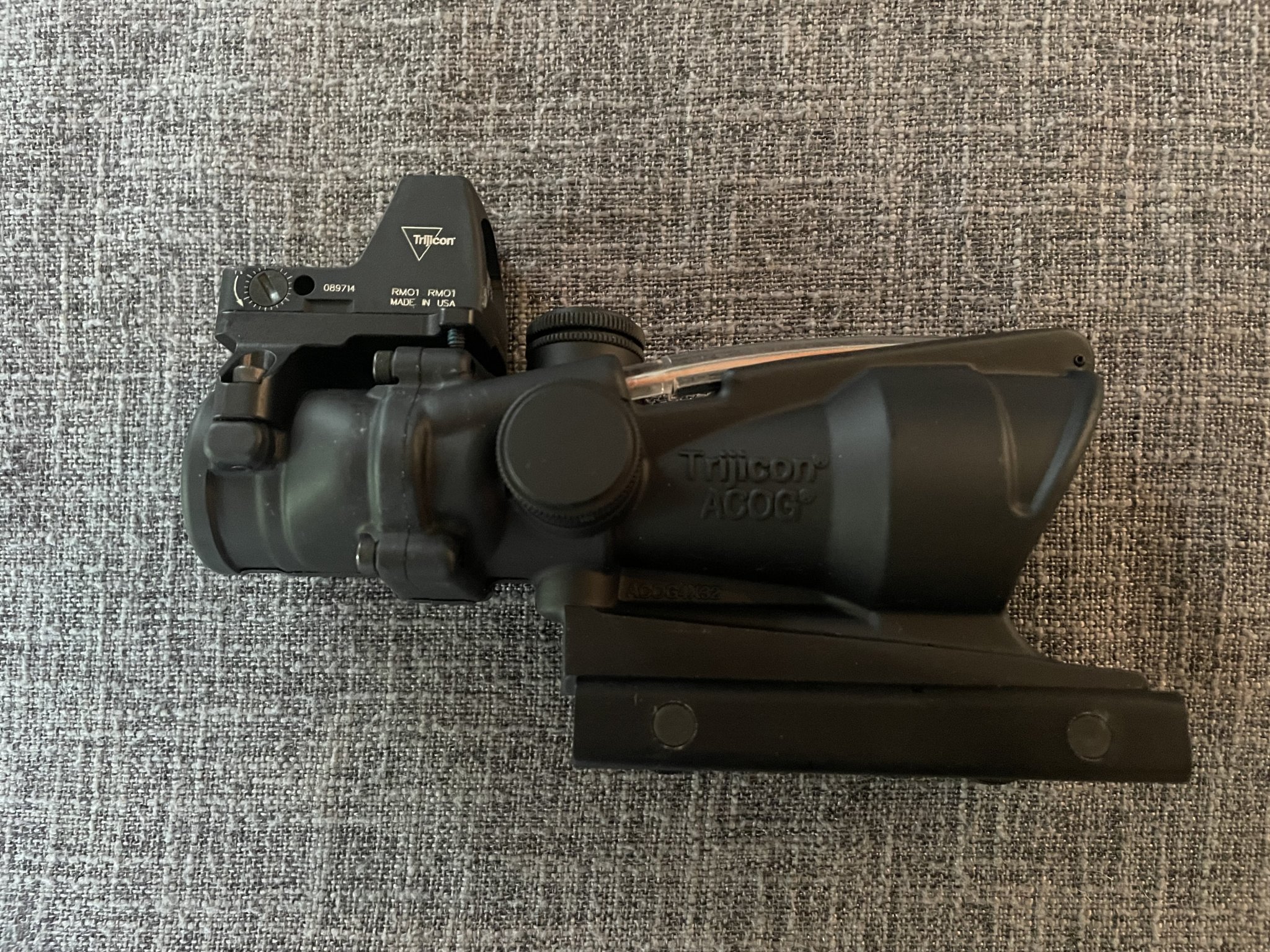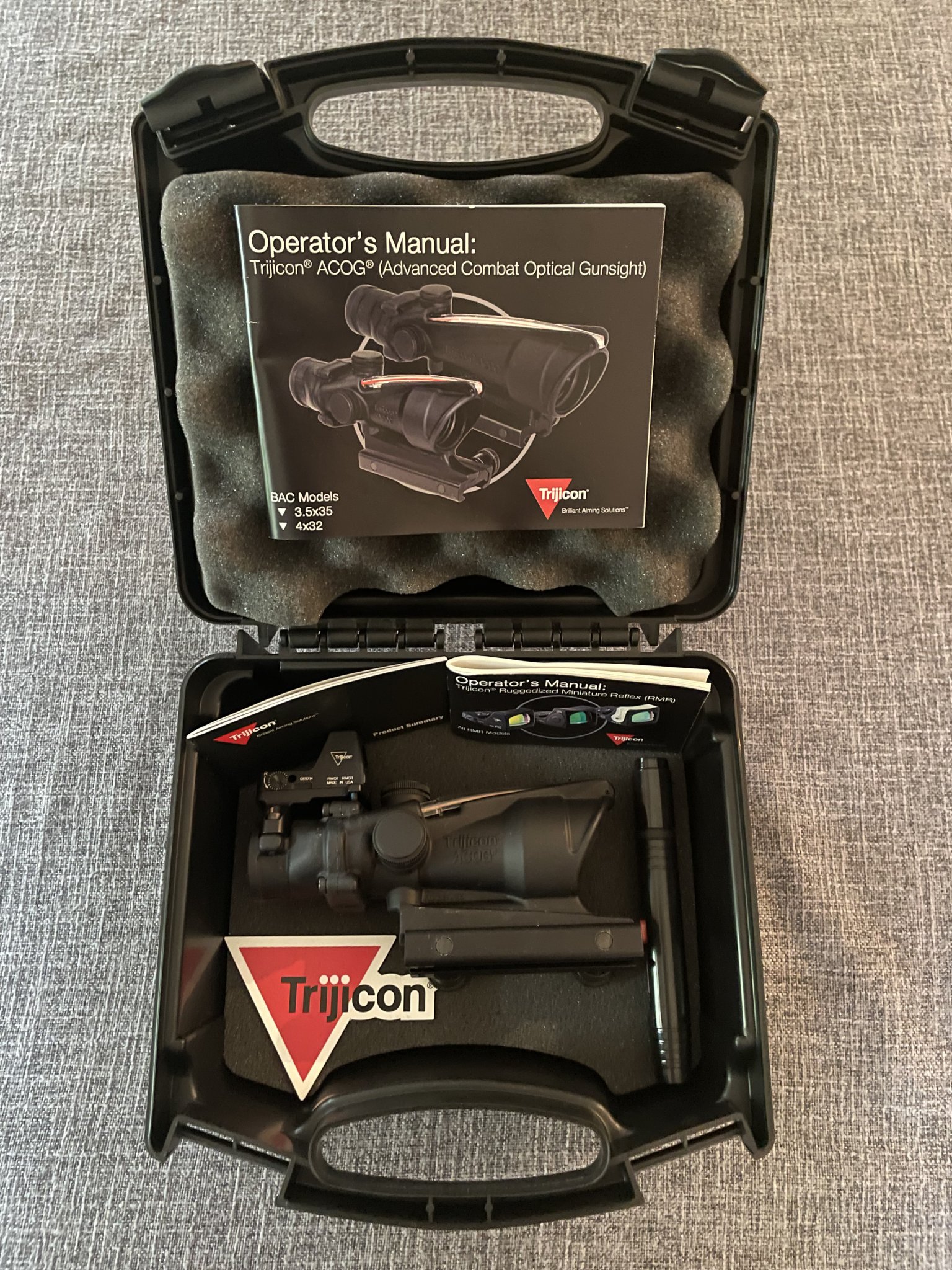 Up for sale is a never used/in the box Trijicon TA31F ACOG rifle scope (.223 BDC / RED Chevron Reticle) with RMR back-up red dot optic. It is mint condition with the original storage box. I'll regret selling this but I'm ginning up funds for the purchase of a new match rifle for next season.