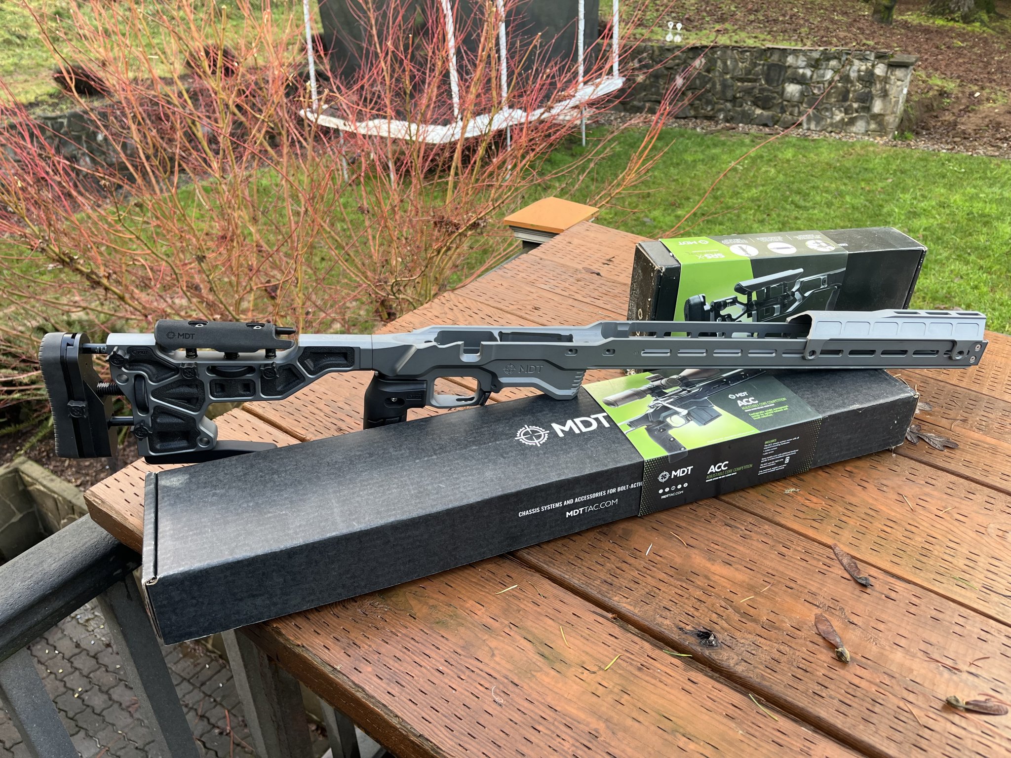 MDT ACC chassis for Rem 700 SA with SRS-X Elite skeletonized buttstock chassis comes with an MDT bag rider, full set of dampers for the stock and the ACC heat shield in matching gray. Everything comes in the original packaging