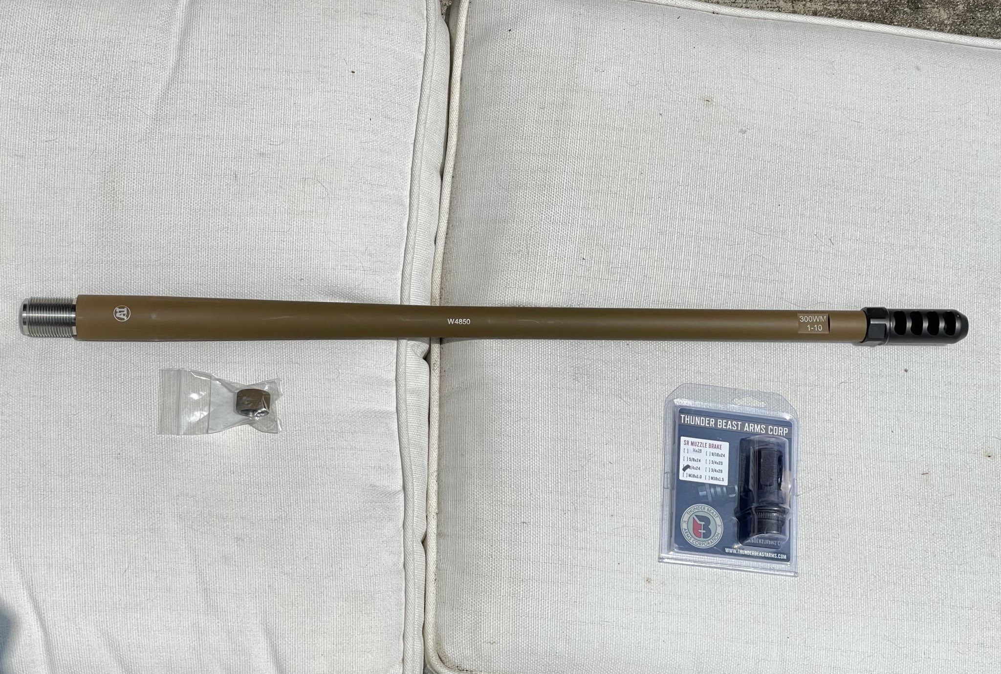 First "For sale post" on this great website (although I have been around for a minute). I am selling a brand-new takeoff AXSR barrel in 300 WM in Dark Earth. Unfired except factory. Comes with APA Fat Bastard brake and thread protector. TBAC SR Brake can be included with the following pricing: