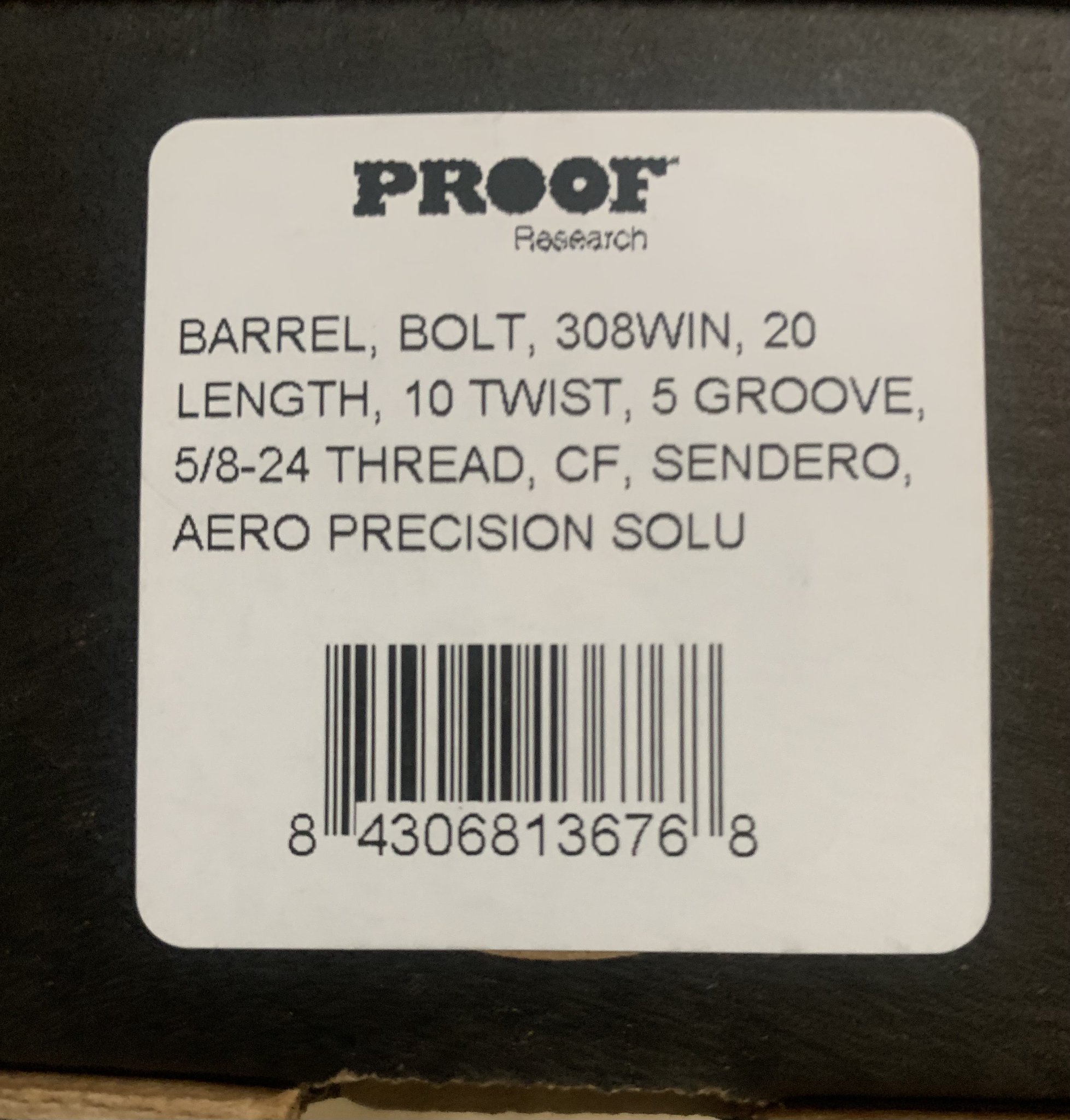 SOLD. I purchased this Proof CF 20" .308 pre-fit barrel for an Aero SOLUS 3 weeks ago brand new in package. I put exactly 39 rounds of Federal Match ammo through it. I ended up going with the SS barrel vs. the CF barrel for PRS weight reasons. This barrel is like new in package. Looking for $650 shipped (no trade offers please).