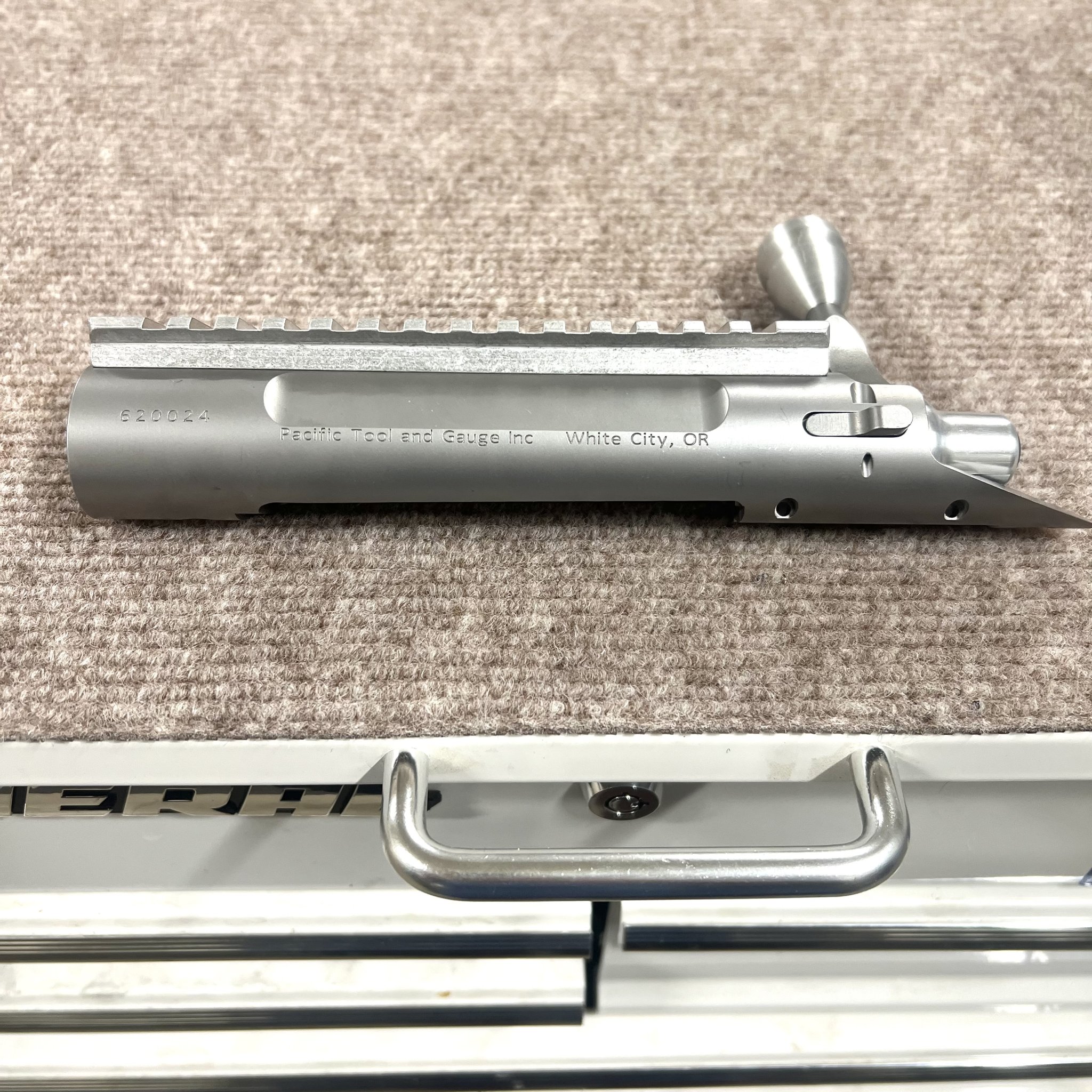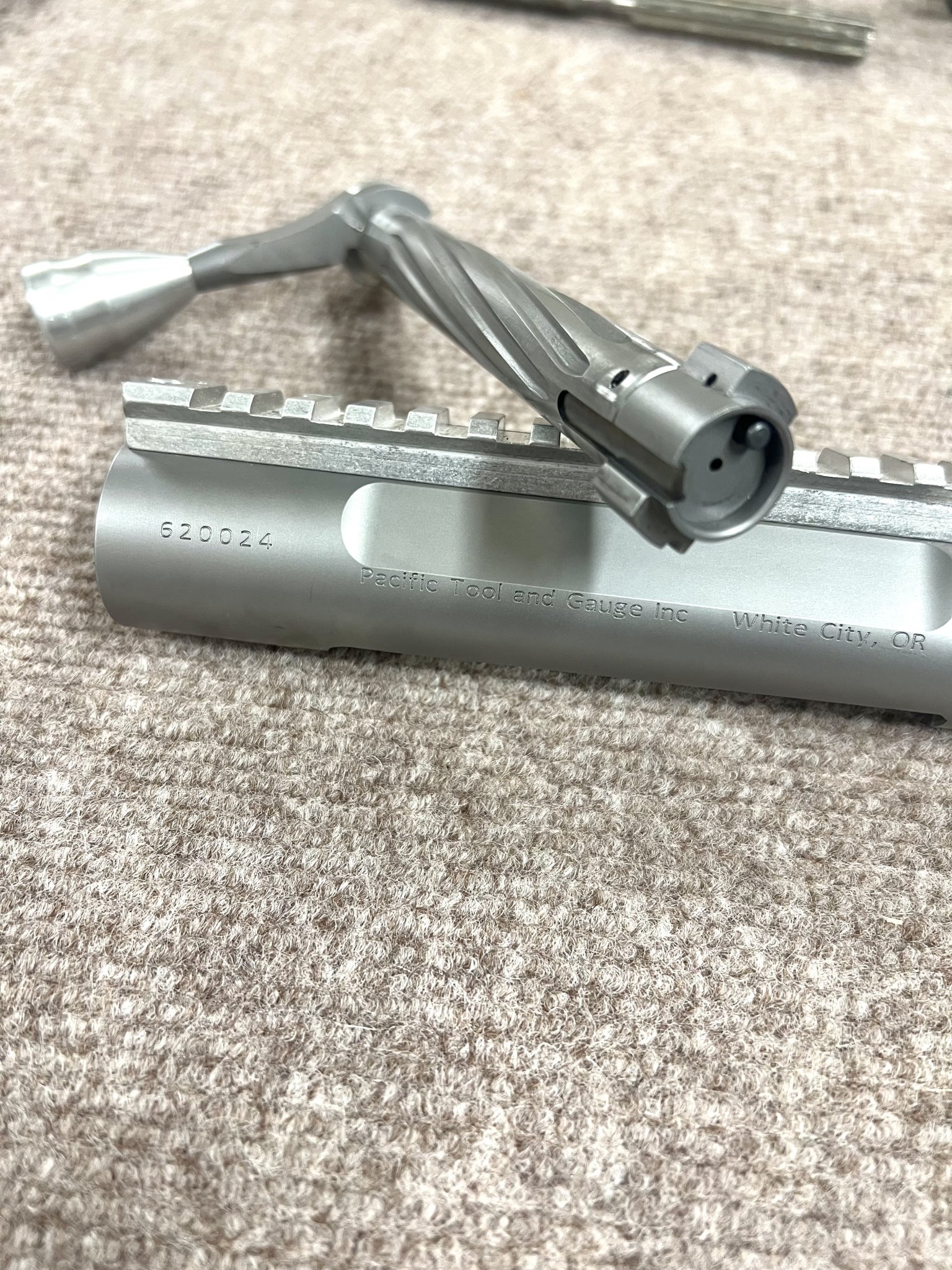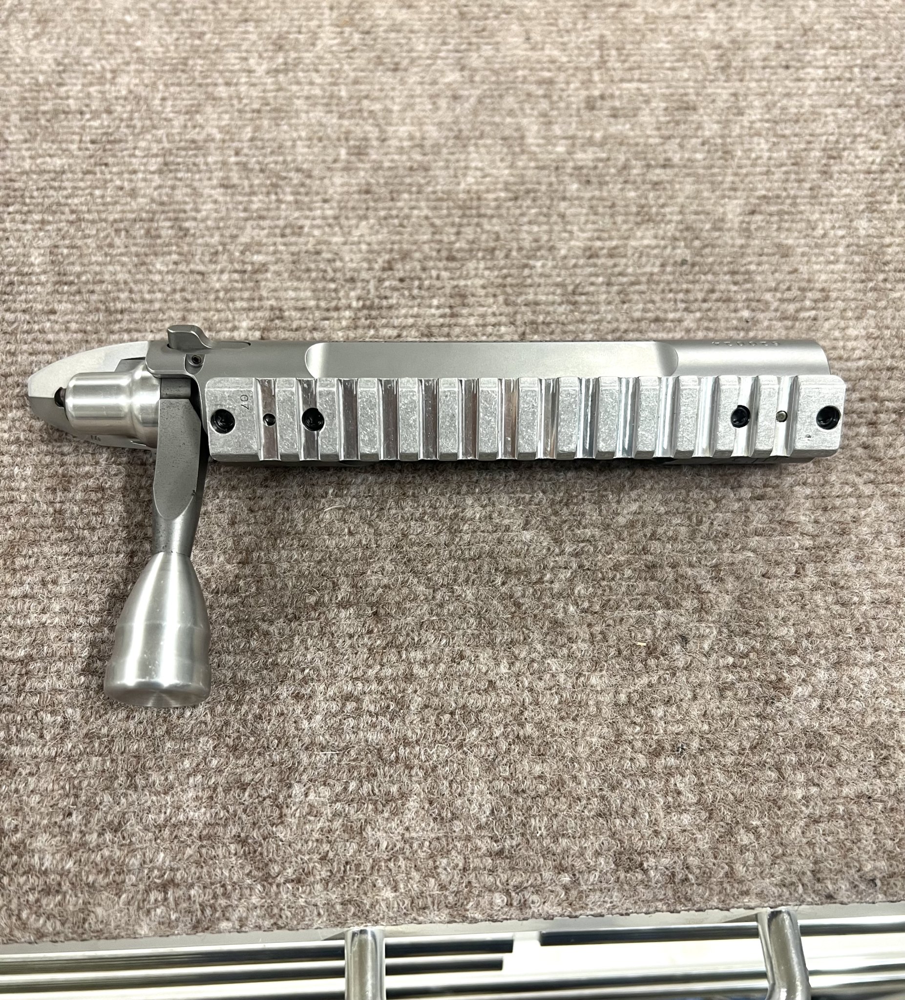 Blueprinted, Stainless, fluted bolt, pinned 20moa rail, external bolt stop, m16 extractor, drilled for recoil lug pin,