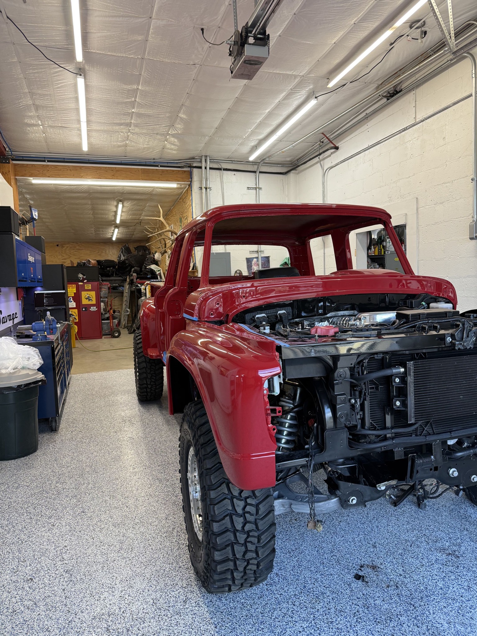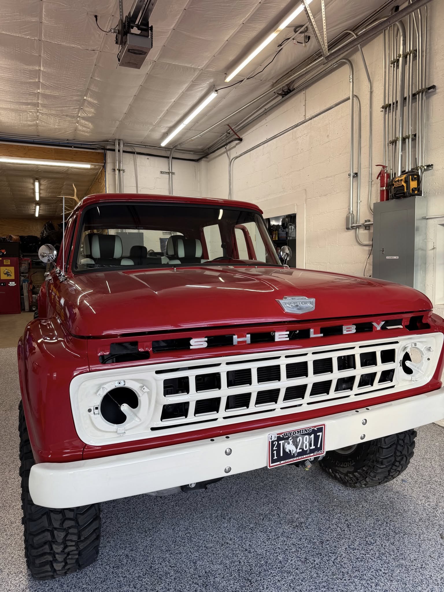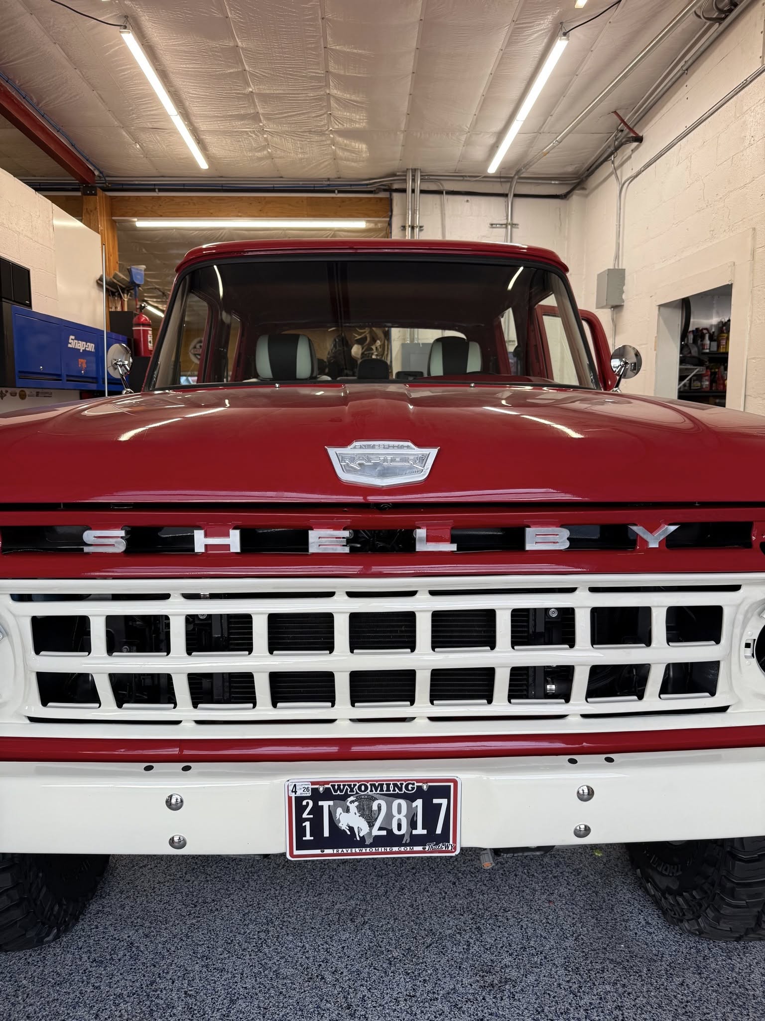 Some folks in WY showed up a few weeks ago with a fun project. They take a V-8 Raptor and send it to Shelby America in Vegas to spiff it up. When it comes back, they remove the cab/bed and replace it with a 1965 crew cab body.
