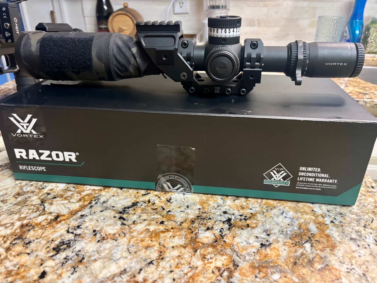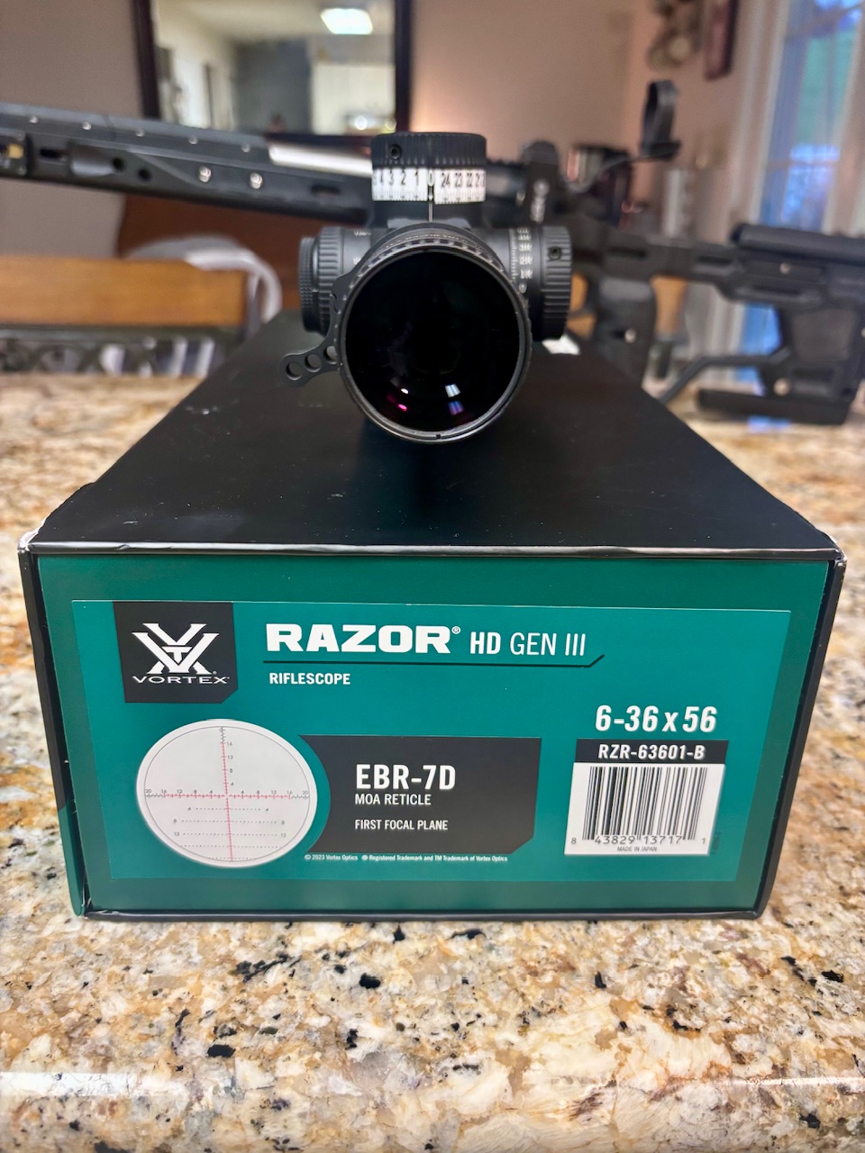 Selling a nice G3 6-36 razor with MOA reticle. Color is black. Cosmetically and functionally in excellent condition. I sent the scope of to Vortex to have them alter the elevation turret, which allows it to be dialed without being “unlocked.” Has the EBR-7D reticle. Also includes the following: