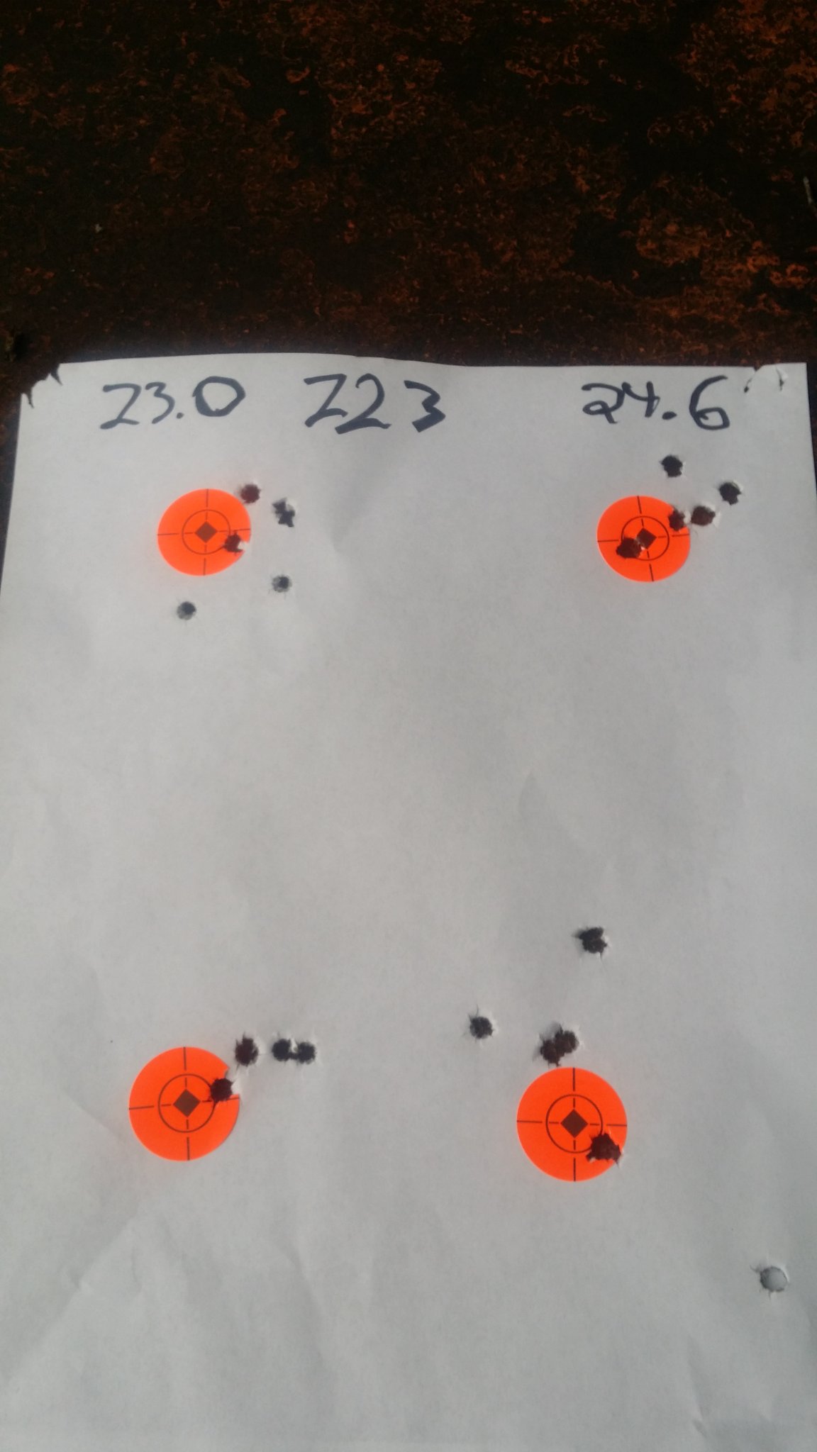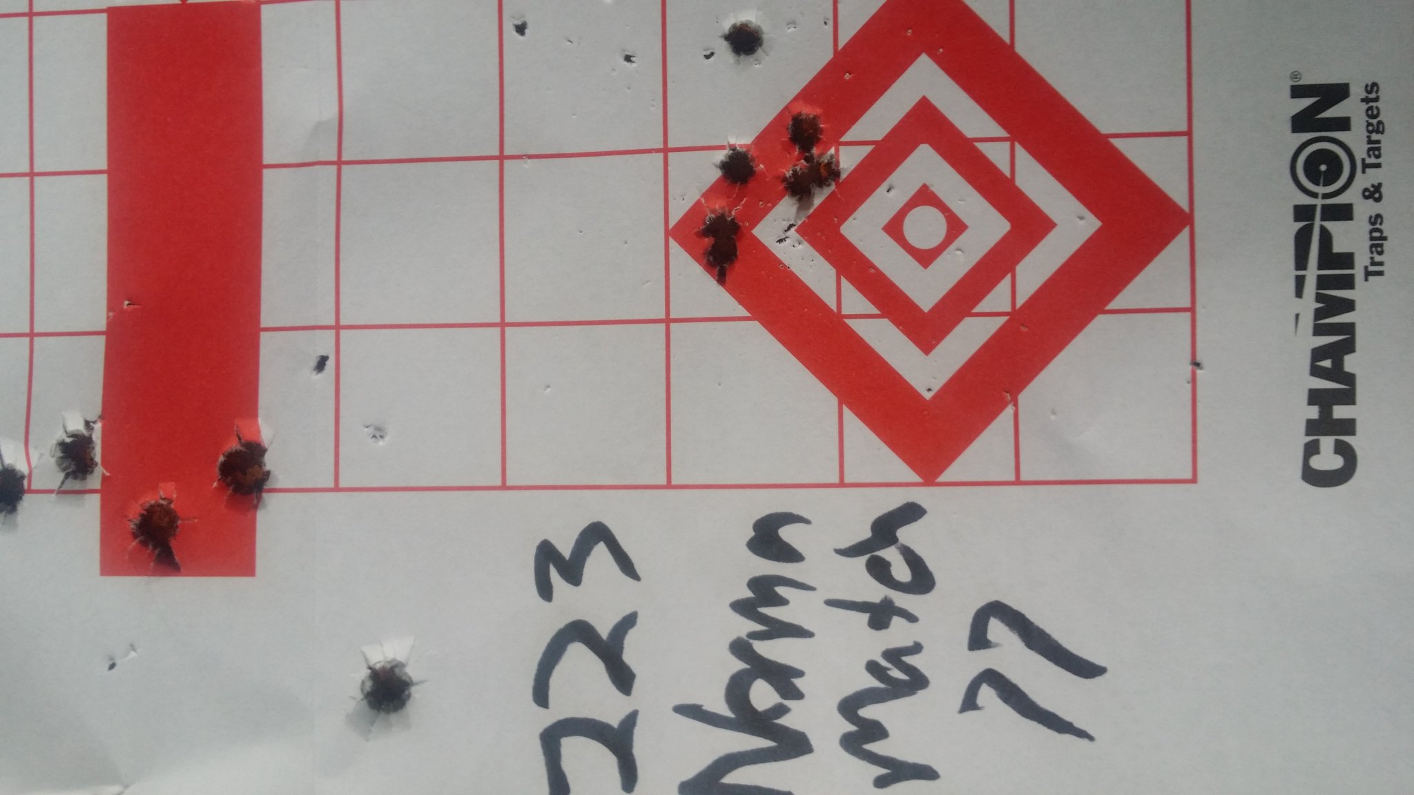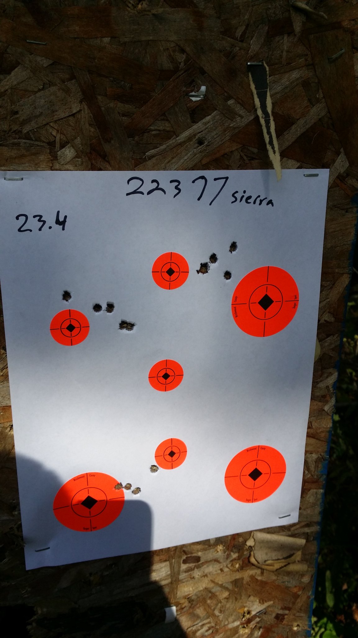 Just started handloading for my 18" 223 wylde SS PSA gun. Using 77s and 75s. It has shot manu sub MOA groups with Hornady Black being the favorite out of all the factory ammo even better than Hornady Match 75s. I assume because the gun likes slower ammo. Here are some groups of my first try at handloads with Hornady brass, CCI br primers, varget and 77s/75s. And the one tight group is how it shoots with hornady black about 1/3 of the time. Also a group with Norma match which it seems to like the best.