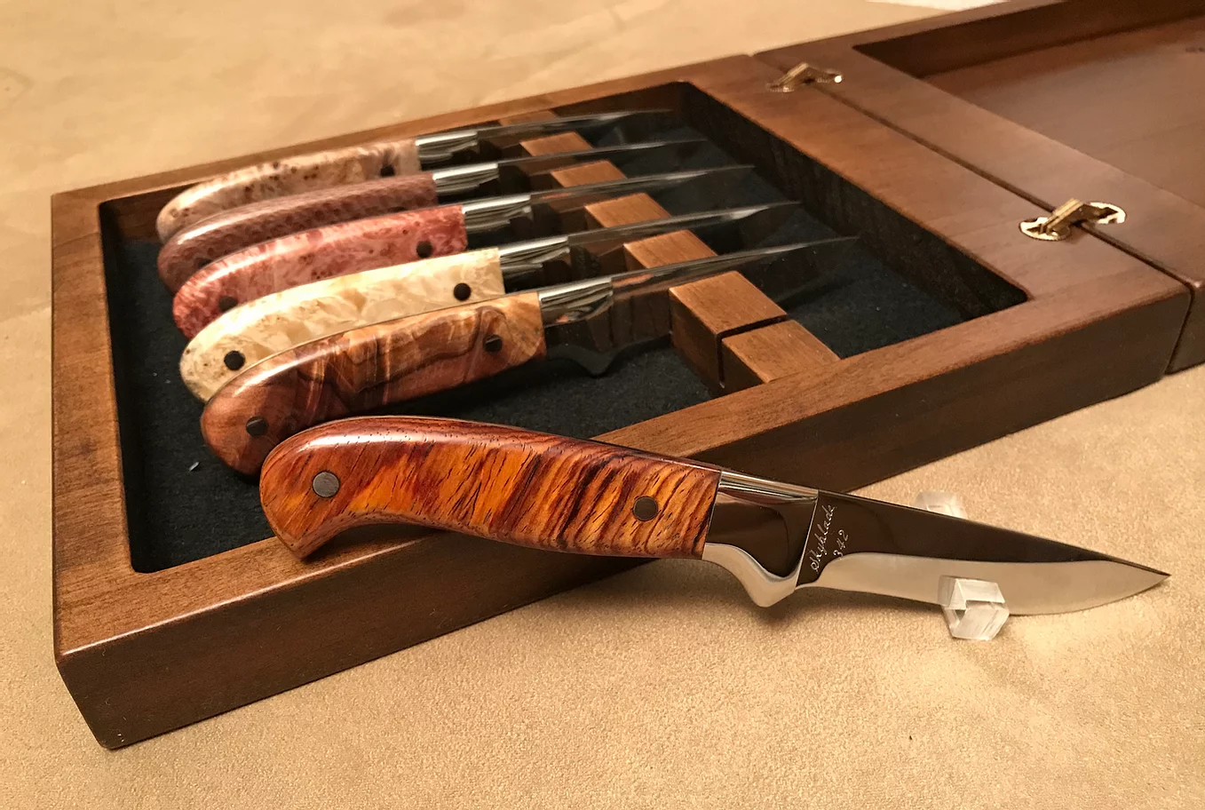 Order one up. It's funny, my main hunting knife actually looks just like the steak knives. On average, I go through about 2 elk, maybe a deer, and 5-6 hogs every year and it never needs sharpening. I take it to him to resharpen every year and am good to go.