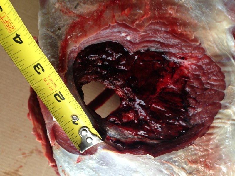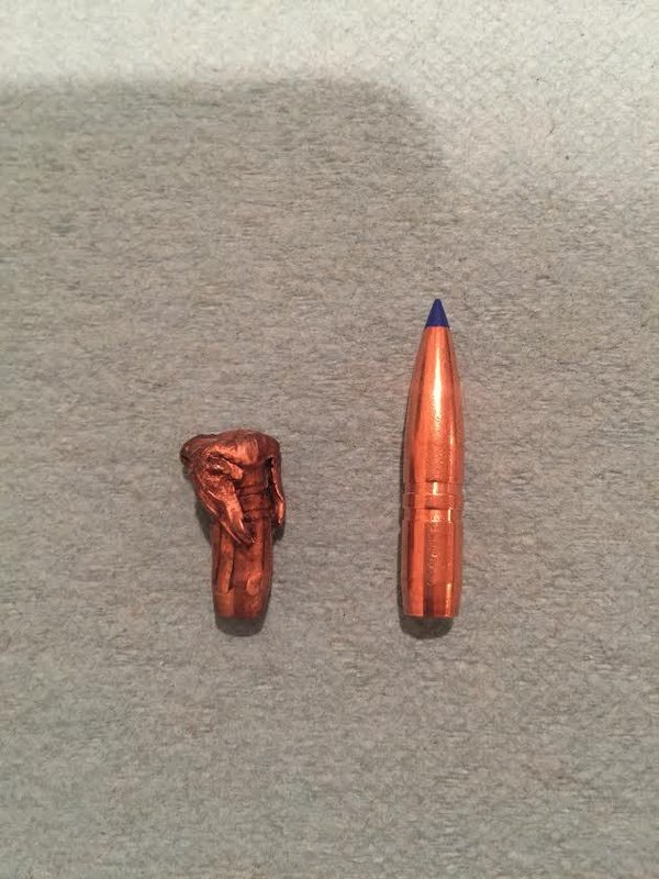 175 eld-x out of a 7mm saum. Two cow elk taken this past season. The recovered bullet was from a quartering away shot at 200 yards and found just under the skin in the off side shoulder about 1 inch from exiting. The exit wound is from a clean pass thru on a quartering to shot at around 115 yards. Both were one shot kills. The first staggered around about 15 yards and dropped. The second stood in its tracks for a few seconds and then dropped.