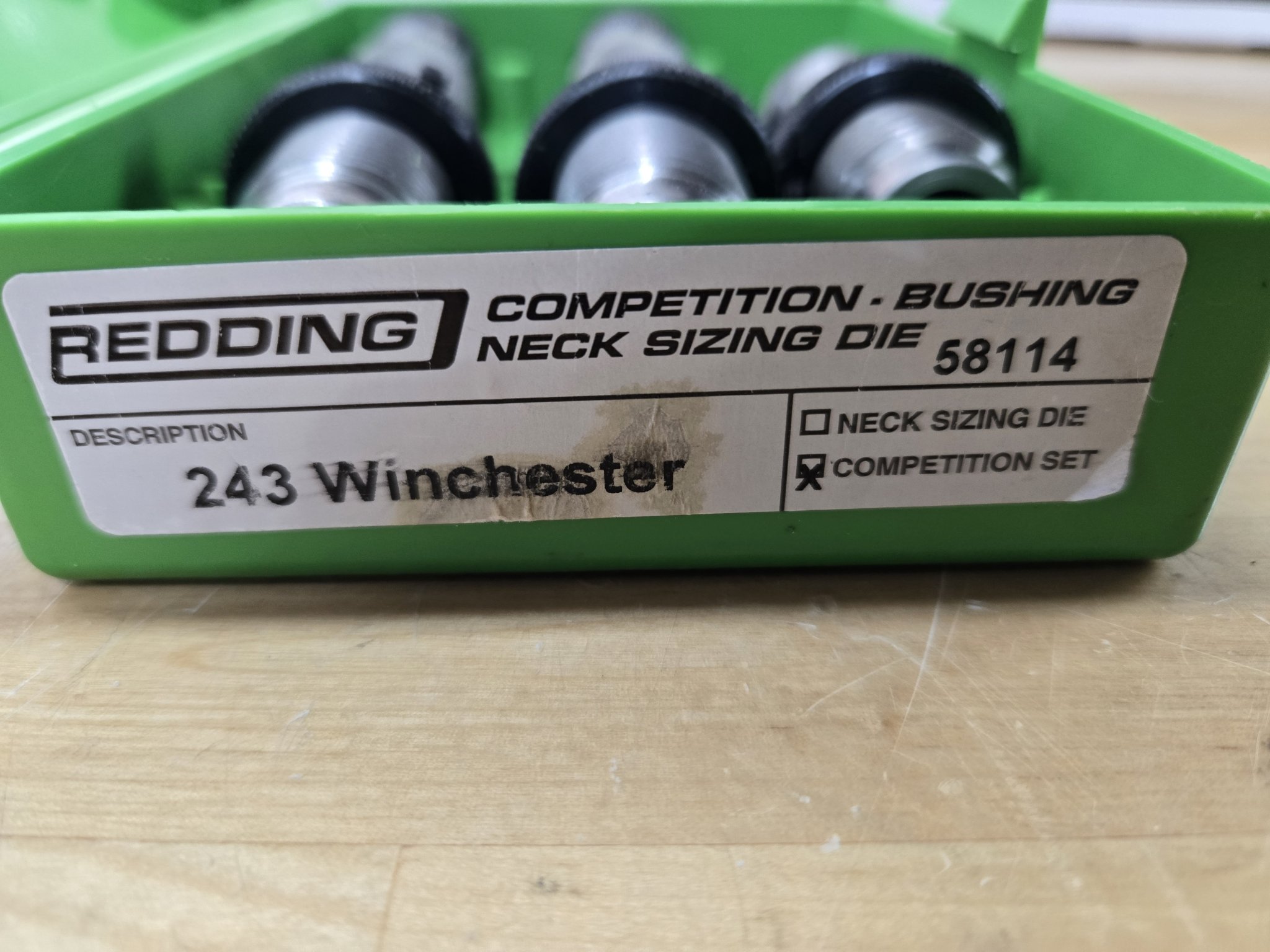 Like new set of Redding Competition Dies for 243. The dies are in great shape but I did carve out some of the Redding case to accommodate the dies with the comp dial installed.