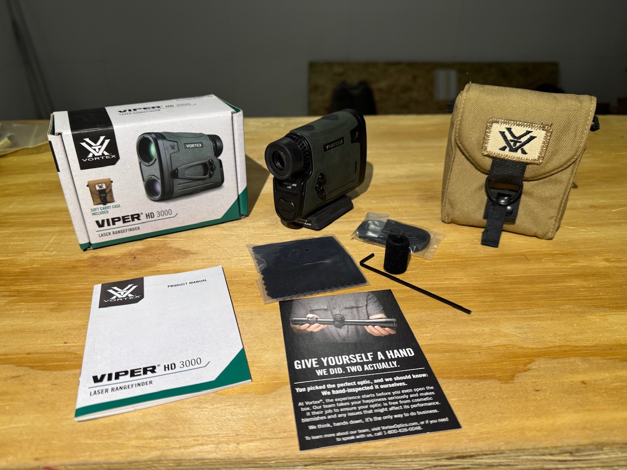 Vortex Viper HD 3000 Range Finder w/ contents shown. Rangefinder was used but very well taken care of. Performs great, only reason for selling is wanting to get a set of rangefinder binos.