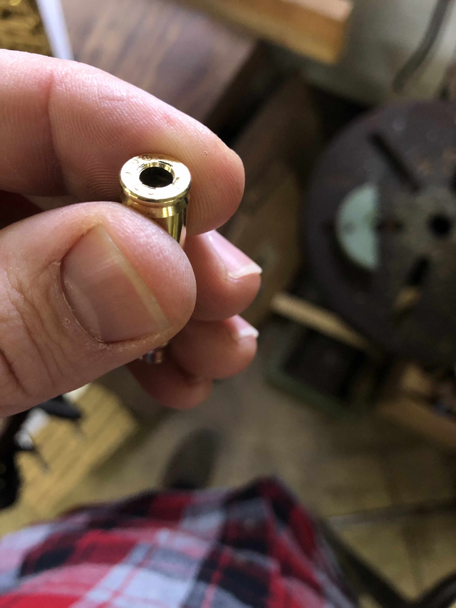 This last pic shows the factory-loaded round next to the reprimed case for easy comparison.