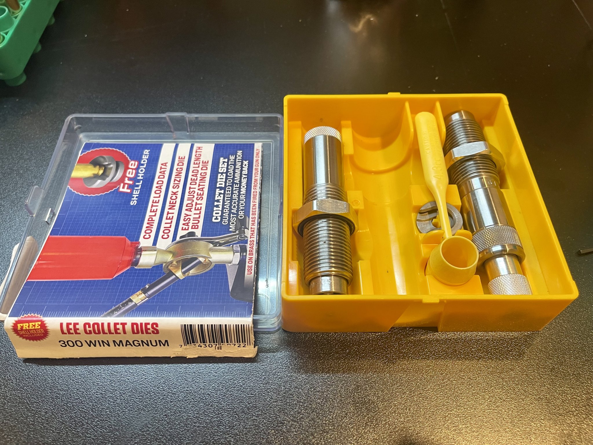-Set of Lee collet dies for 300Win Mag, sizing and seating die. Includes shell holder. Used for less than 100 cases, just switching to FL bushing dies. $60