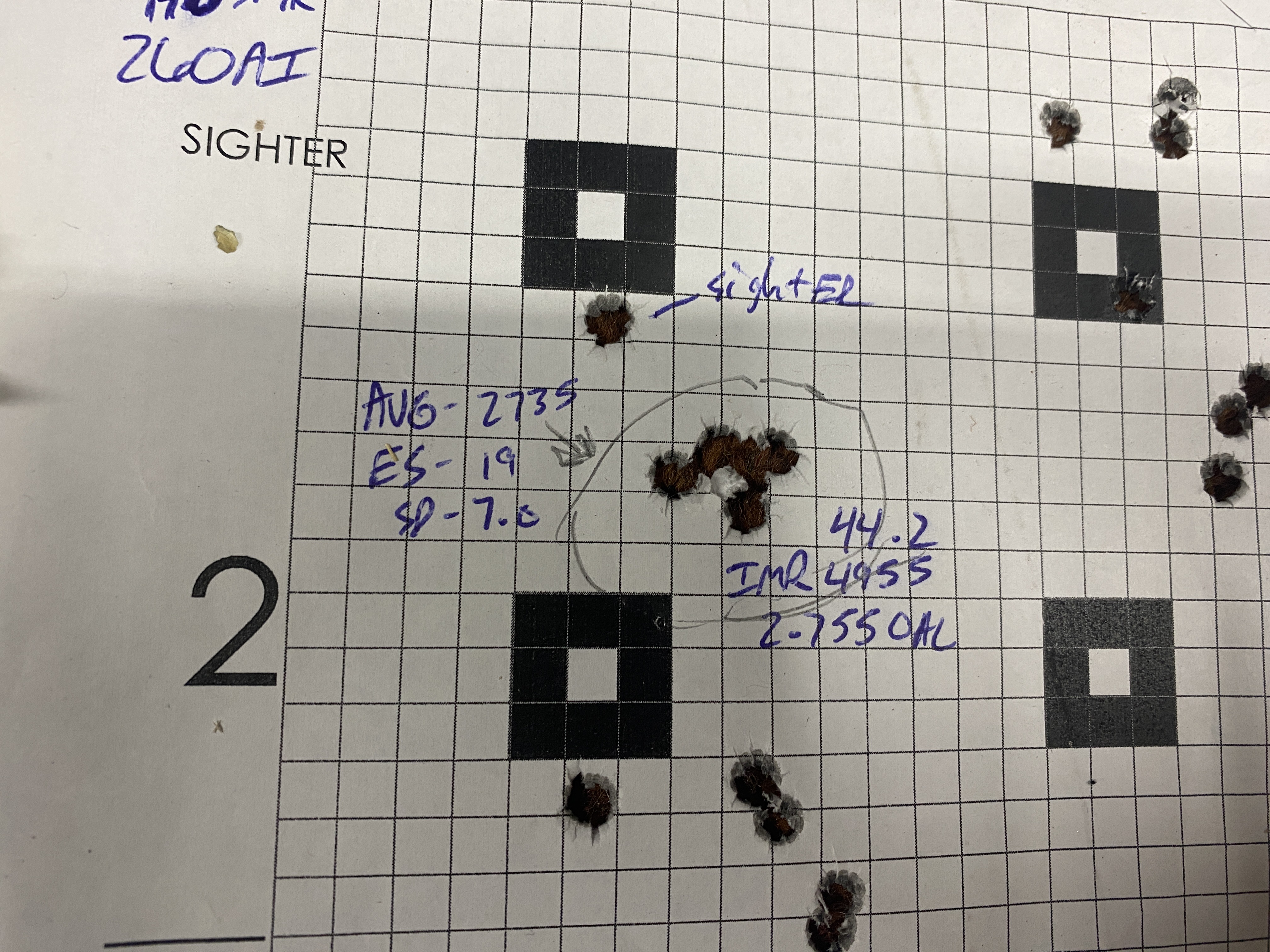 Most promising load was 44.2 IMR4955, 2.755 COAL @ 2735 FPS, ES-19, SD-7.