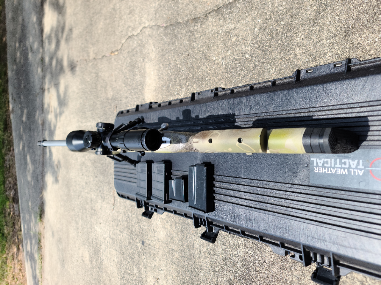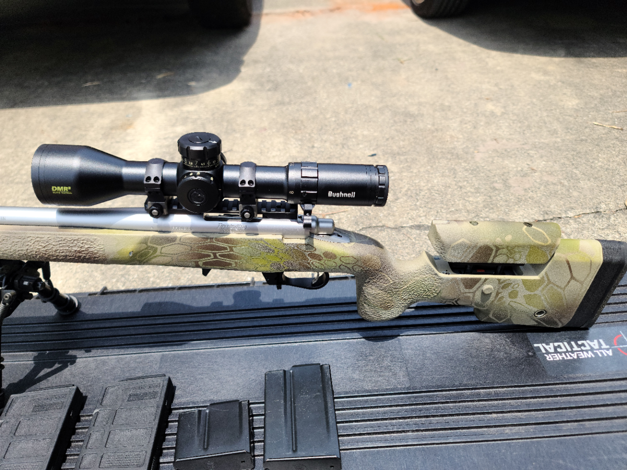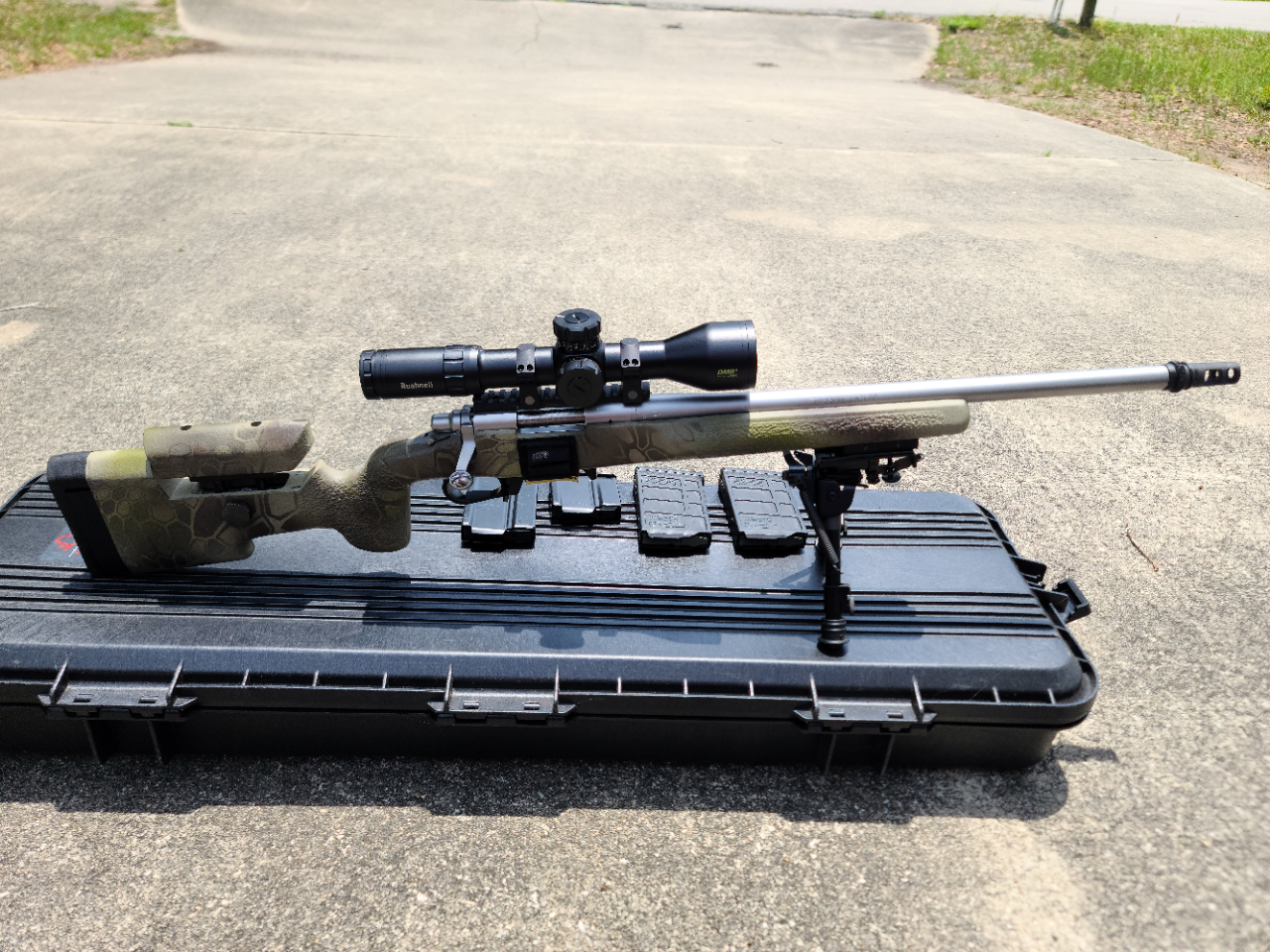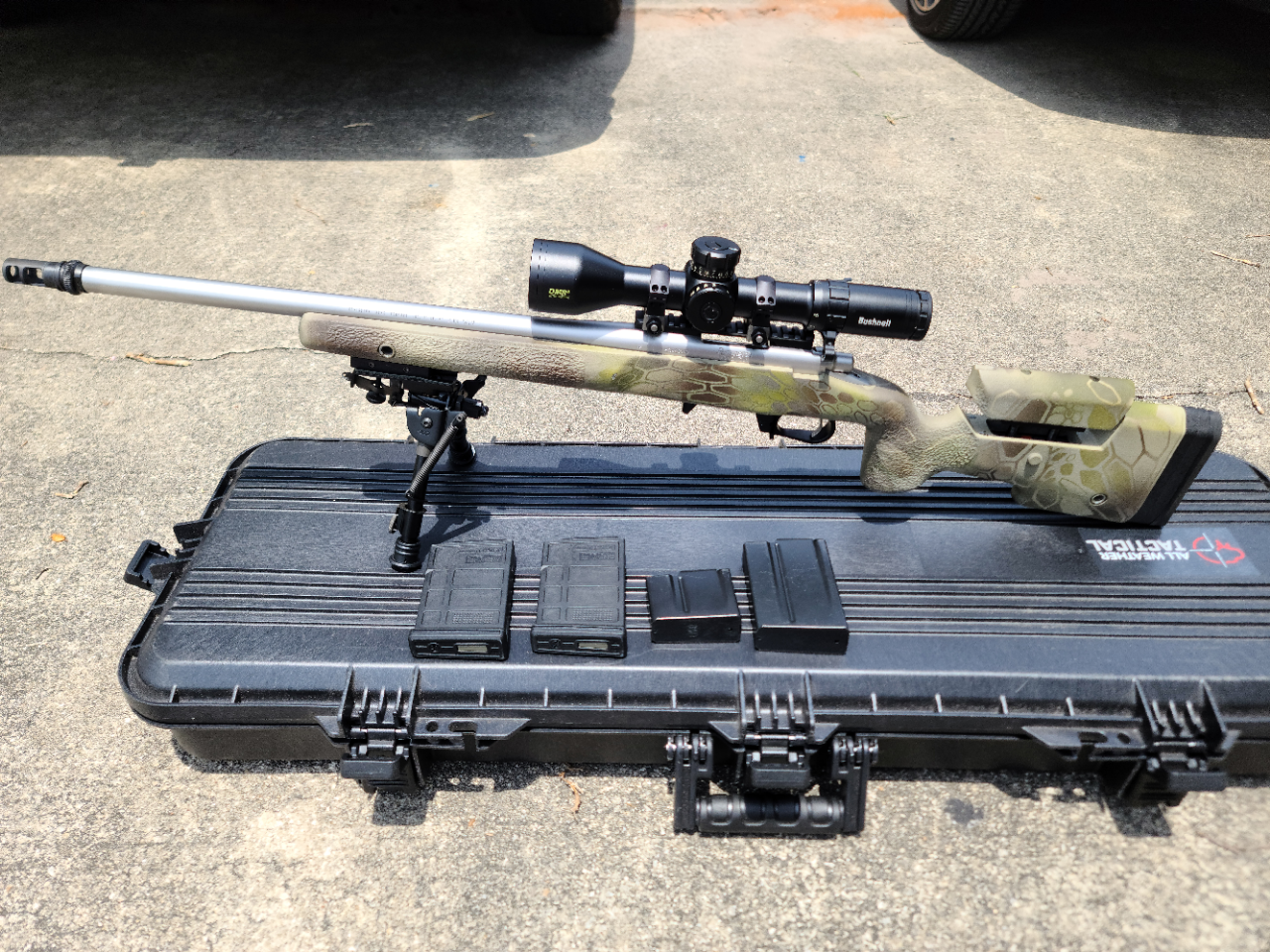 Remington 5R in 308. 20" stainless threaded heavy barrel, jeweled bolt, 1:11-1/4 twist rate, perfect for 175g rounds. The only ammo ever fired with it was 175g Sierra MatchKing