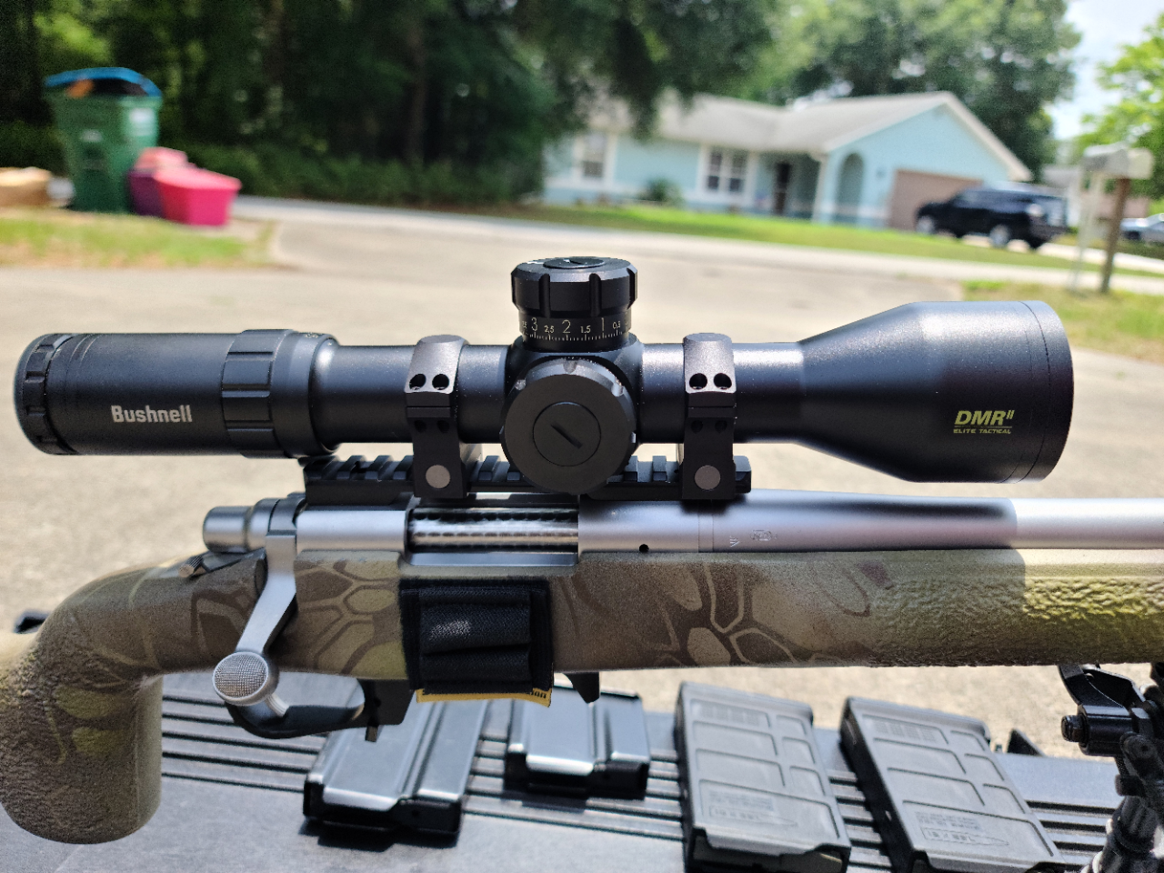 Scope is a Bushnell Elite Tactical DMR II 3.5-21 G3 reticle sitting in Nightforce Ultralight medium height rings. -Included with the rifle a couple bullet binders, and a total of four magazines, two of which are metal AI ones, the case is also included.