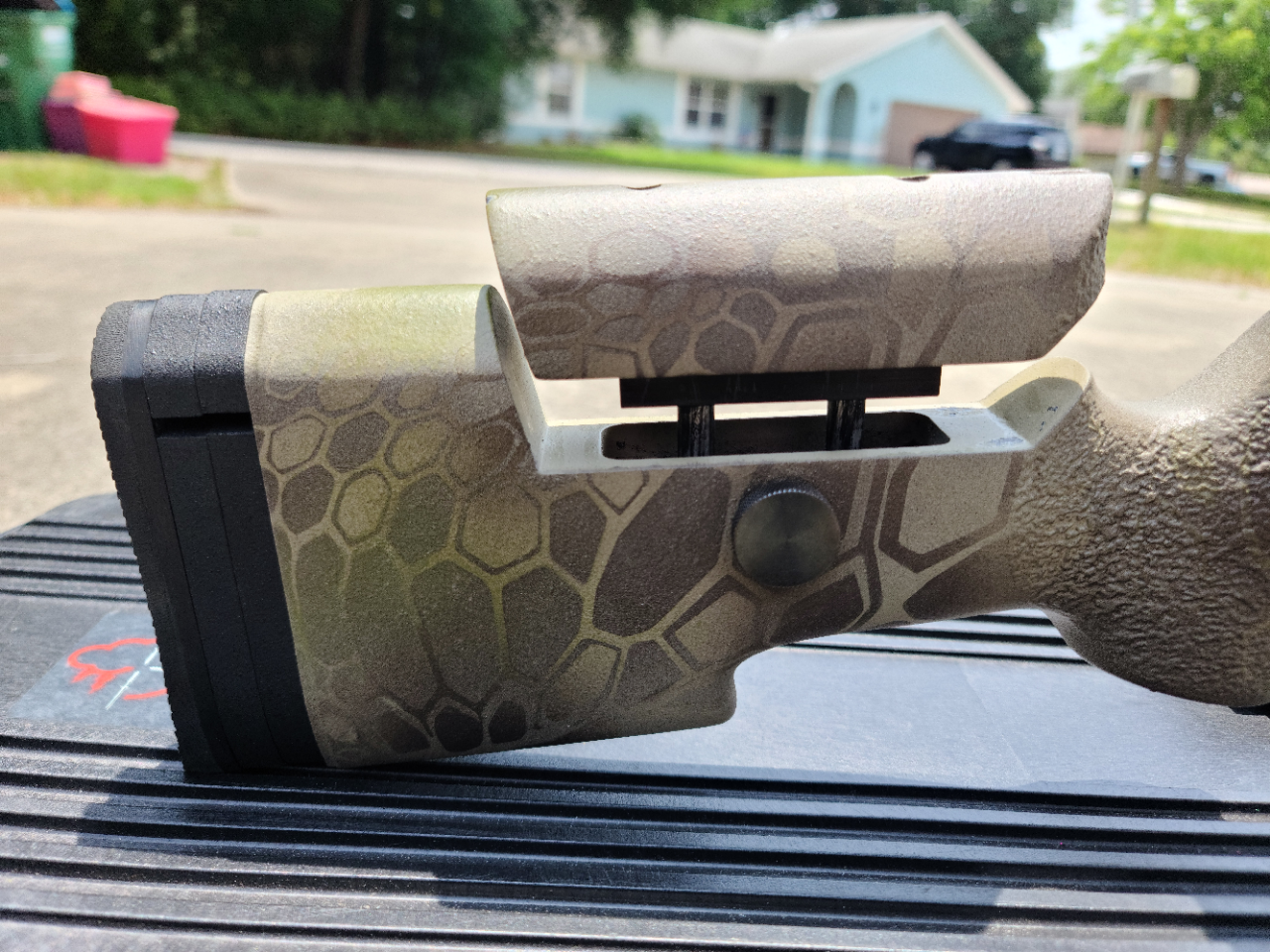 McMillan A5 stock with adjustable cheek weld, has flush cups and Atlas rail. Stock was professionally bedded by Phoenix arm, and inletted for Surgeon DBM. The rifle fits like a vacuum and is perfectly fitted to the stock.