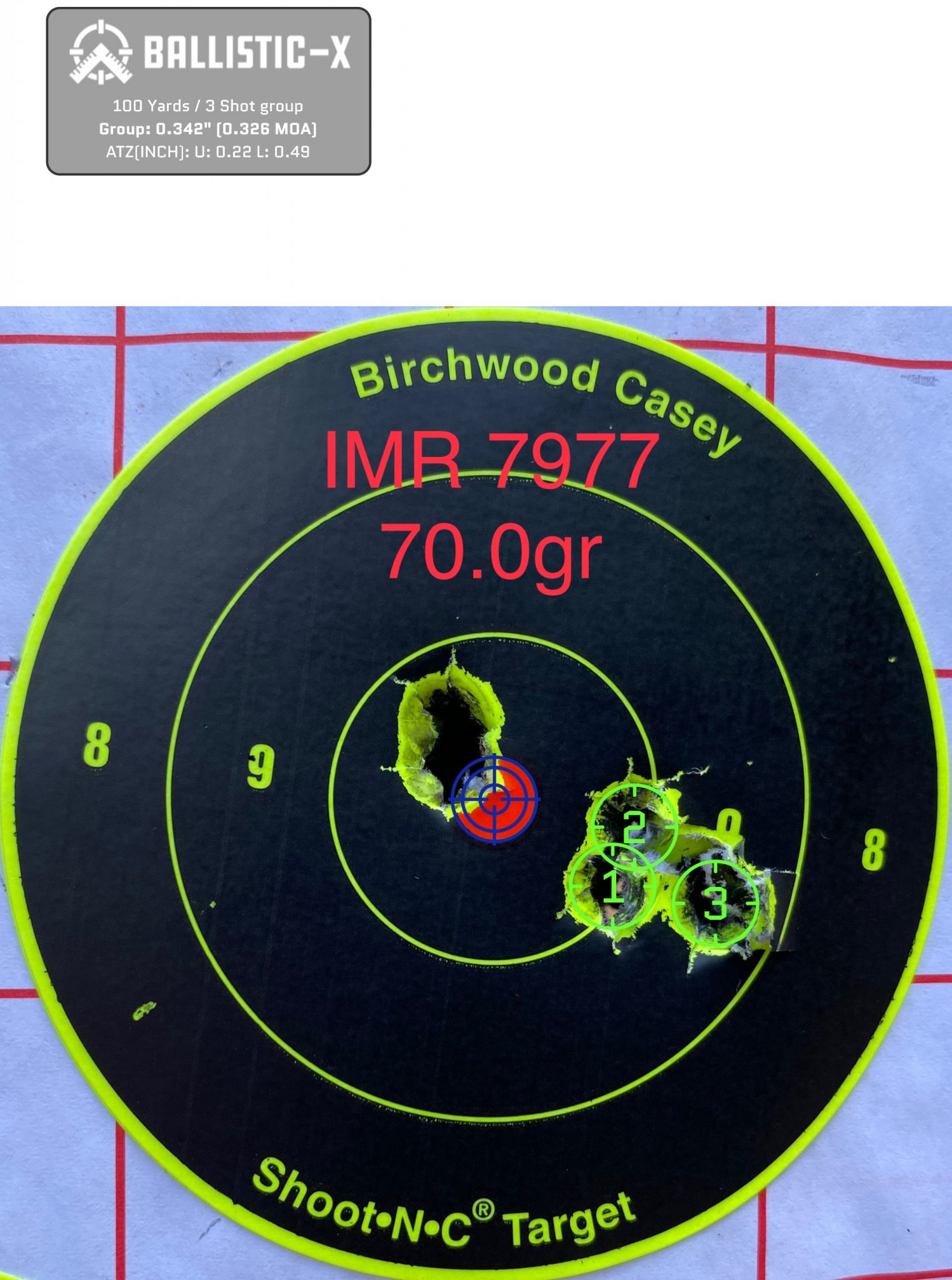 I'm telling you... Try to get your hands on some IMR 7977 and CCI 250 primers with Nosler brass. You won't regret it...Tested 10 today five for groups and five for FPS. First shot was low right, second was high right. Last three were within moa all together it was 2.5 moa