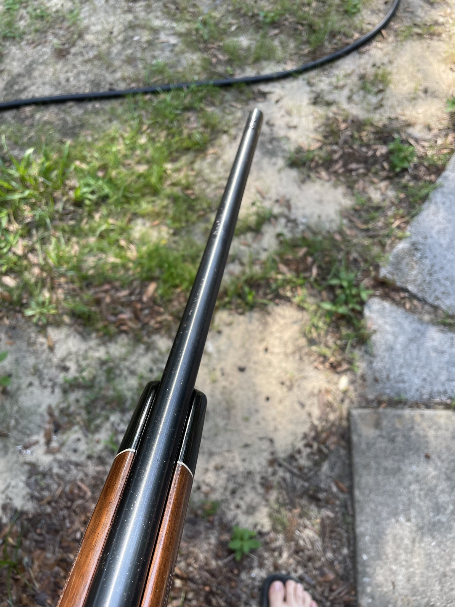 Now, there are some cosmetic issues on the top of the barrel. It poured on me during a hunt, I put the rifle in the case and didn't pull it out for 24 hours. rookie move right? you can see some cosmetic blems in the bluing, however the bore is clean as a whistle and the rifle still shoots just as well as before.