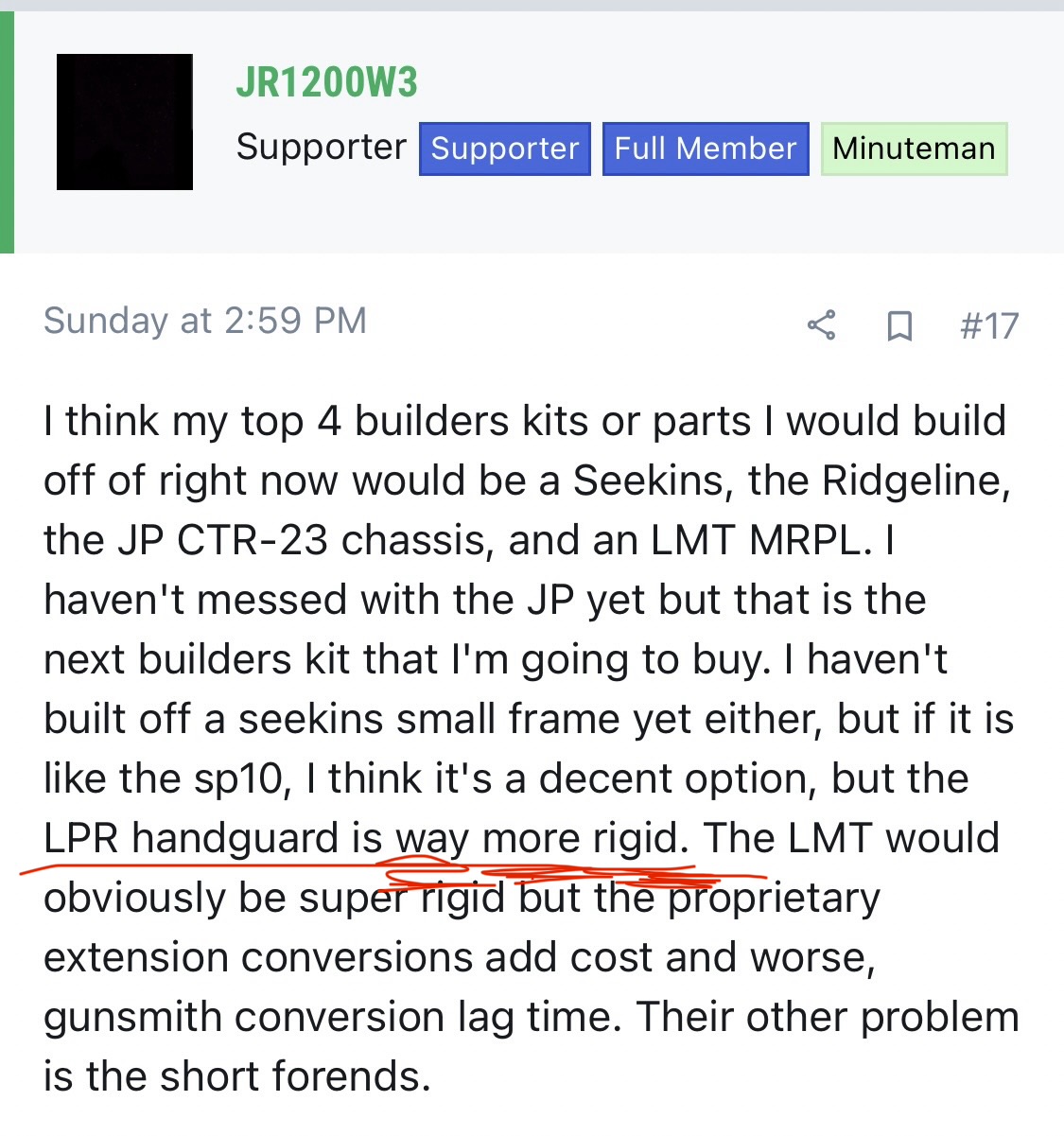 You can't legitimately say the Seekins "has no flex". You might be able to argue the amount of flex present is inconsequential enough to not matter and so good enough is good enough. And I would agree with that, but that doesn't mean the LPR still isn't more rigid. I never said it mattered on paper, I just made the distinction that the LPR has a more robust and better designed joint between the upper and handguard.I’m not calling you a liar. I’m just saying your statement seemed very exaggerated. Another member commented the same thing. It’s my opinion. I don’t need to hold them side by side to honestly believe your statement was exaggerated. I have a lot of Seekins, small and large frames. When there’s not any flex it’s impossible to have “way better no flex”. Anyway, Jesus, I honestly don’t care lol.