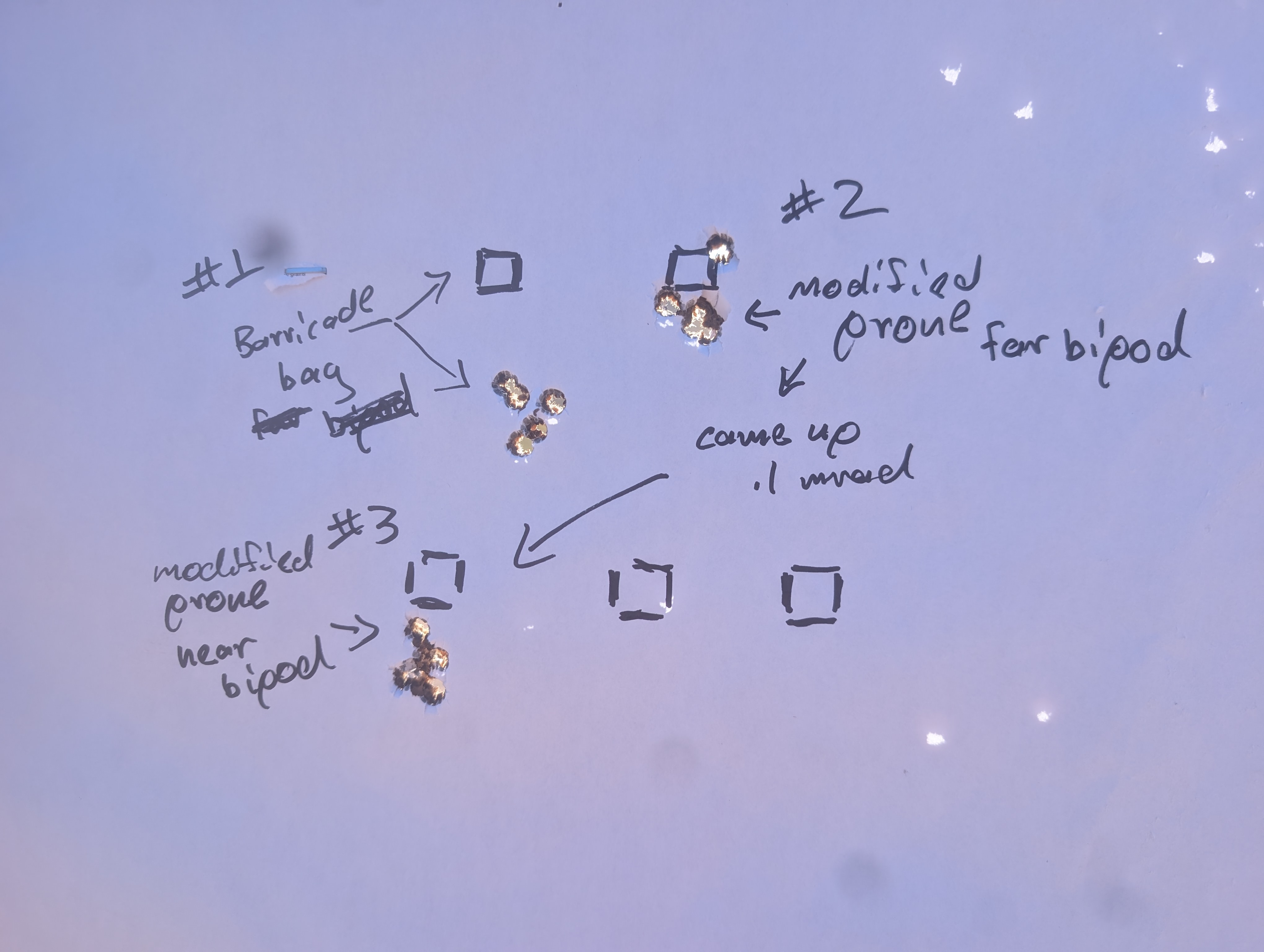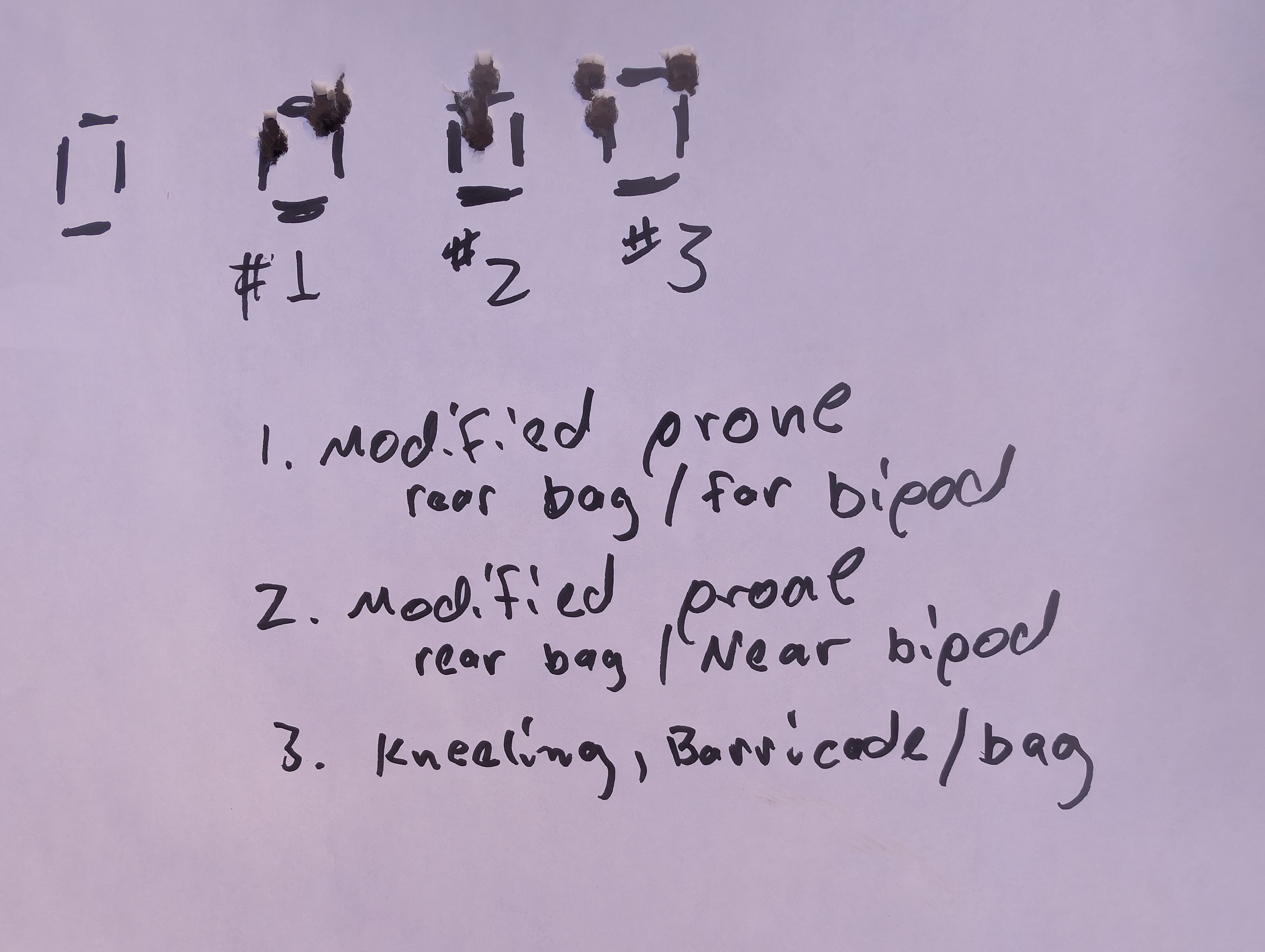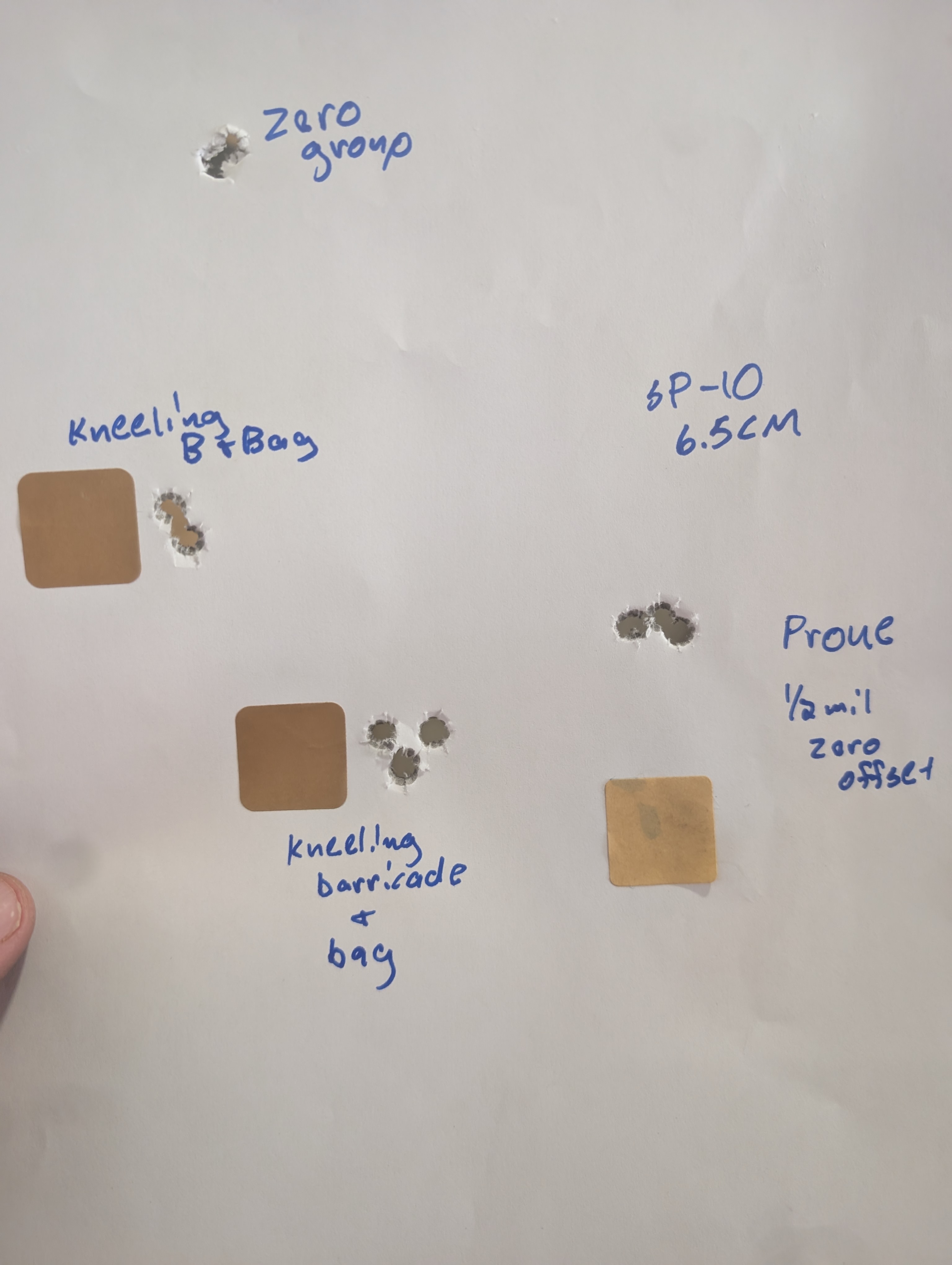 So today I went to the range with the intent to shoot two 5rd groups kneeling off a barricade and bag. Shoulda been a simple positional zero confirm. But it wasn't. First 5rd group kneeling, barricade/ bag was .4mrad low. (Top left). So I shot modified prone off a concrete bench. POI .1mrad low. (Top right). So I came up .1 and shot a 5rd group modified prone, bipod slid all the way back to just in front of the magwell. .3mrad low.