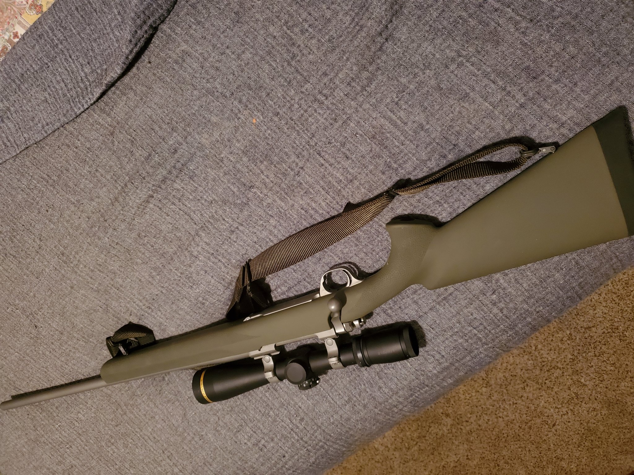 Ruger M77 338 Federal stainless Houge pillar OD green stock w 2 sets of ruger stainless rings 1 inch and 30 mm