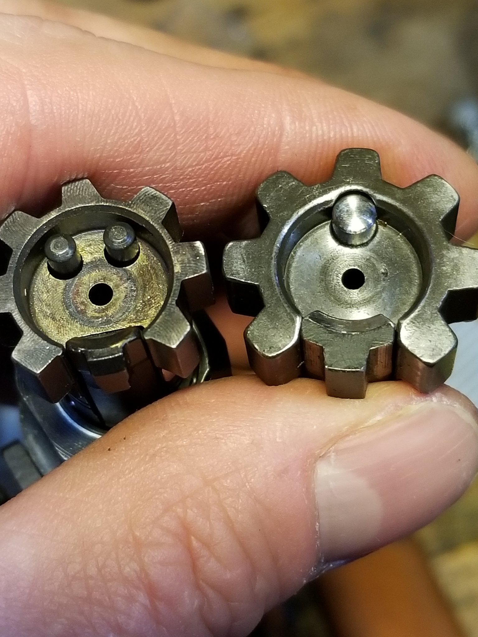 But in the process I noticed one of the ejector pins was hanging up on some kind of burr where the hole for the retaining roll pin was drilled. Made it a real challenge to get the ejector pin and spring out of that hole so I ended up deburring the inside of both holes as well.