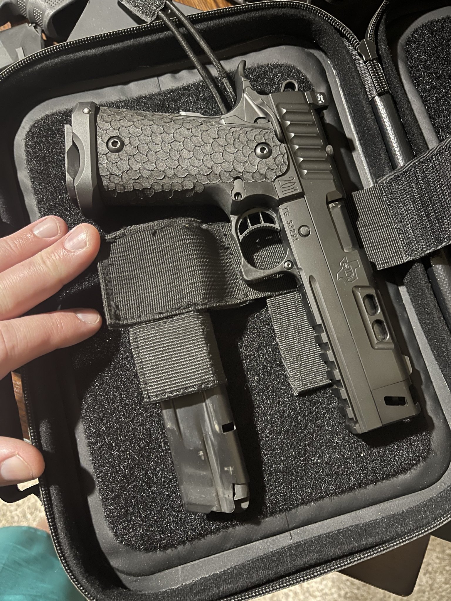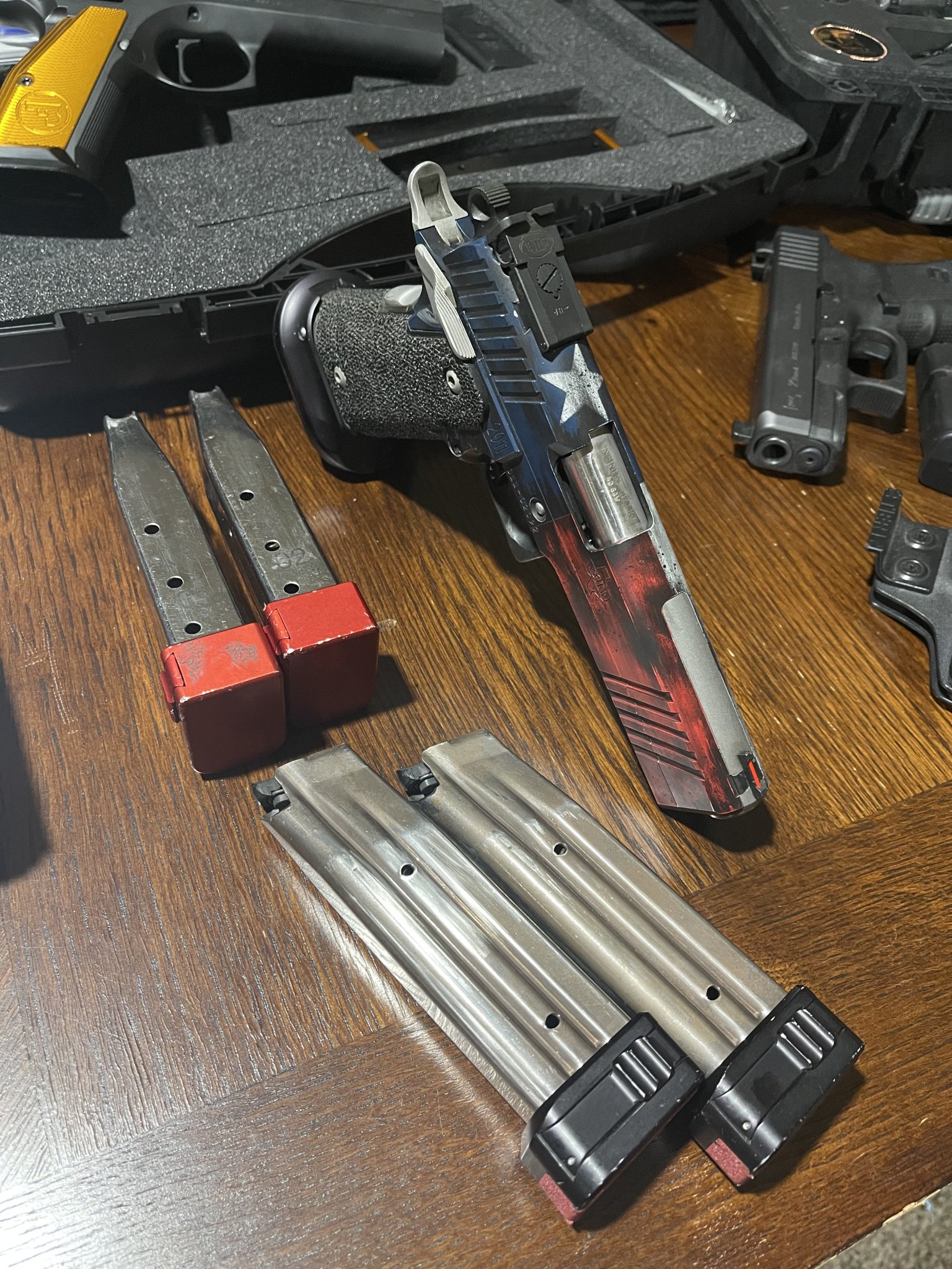 $3500 $3250 - STI/SVI Clark Custom sight tracker 2011 in .40. Shoots major and minor lights out. Distressed Texas flag Cerakote by RBGW.