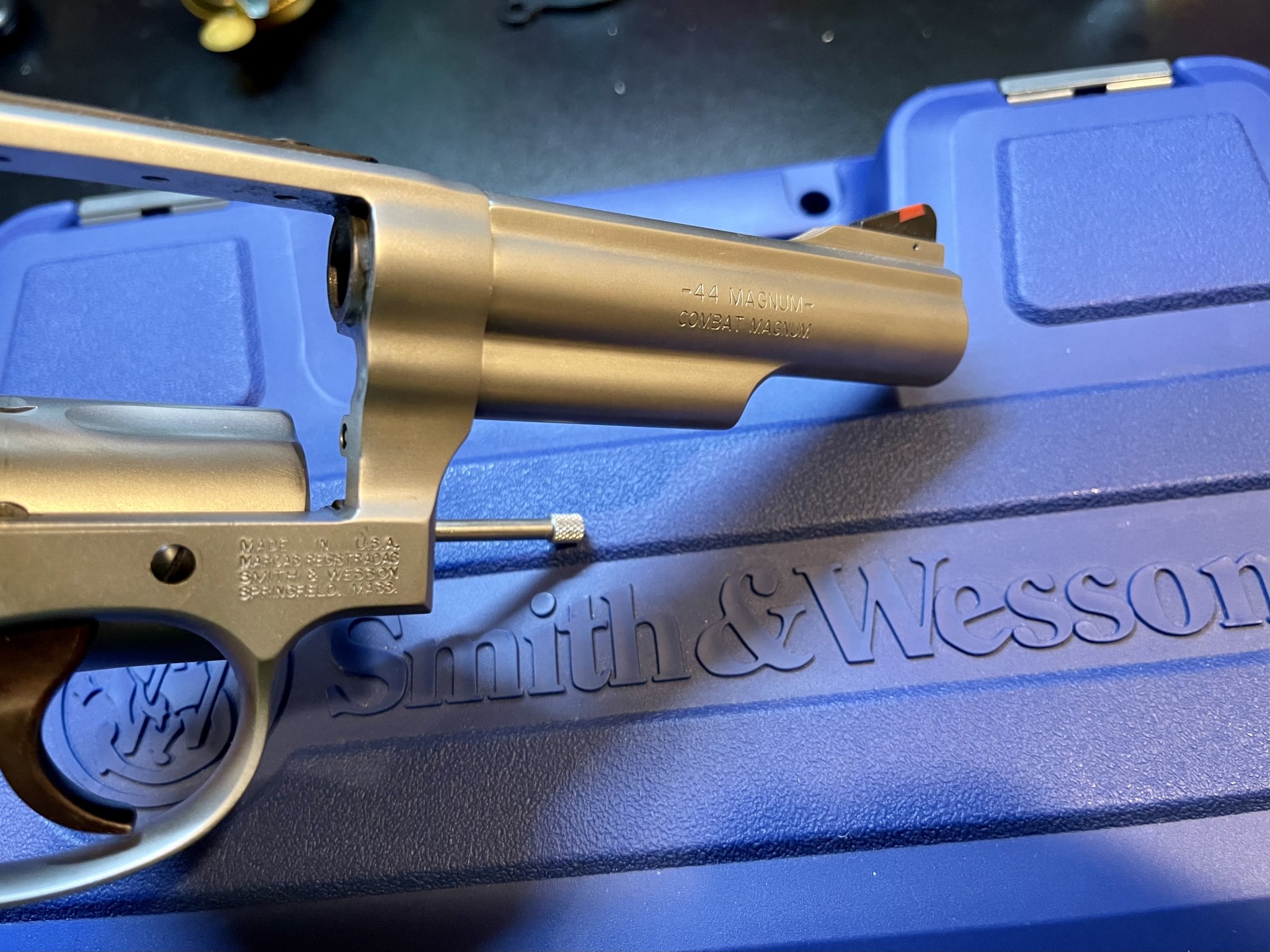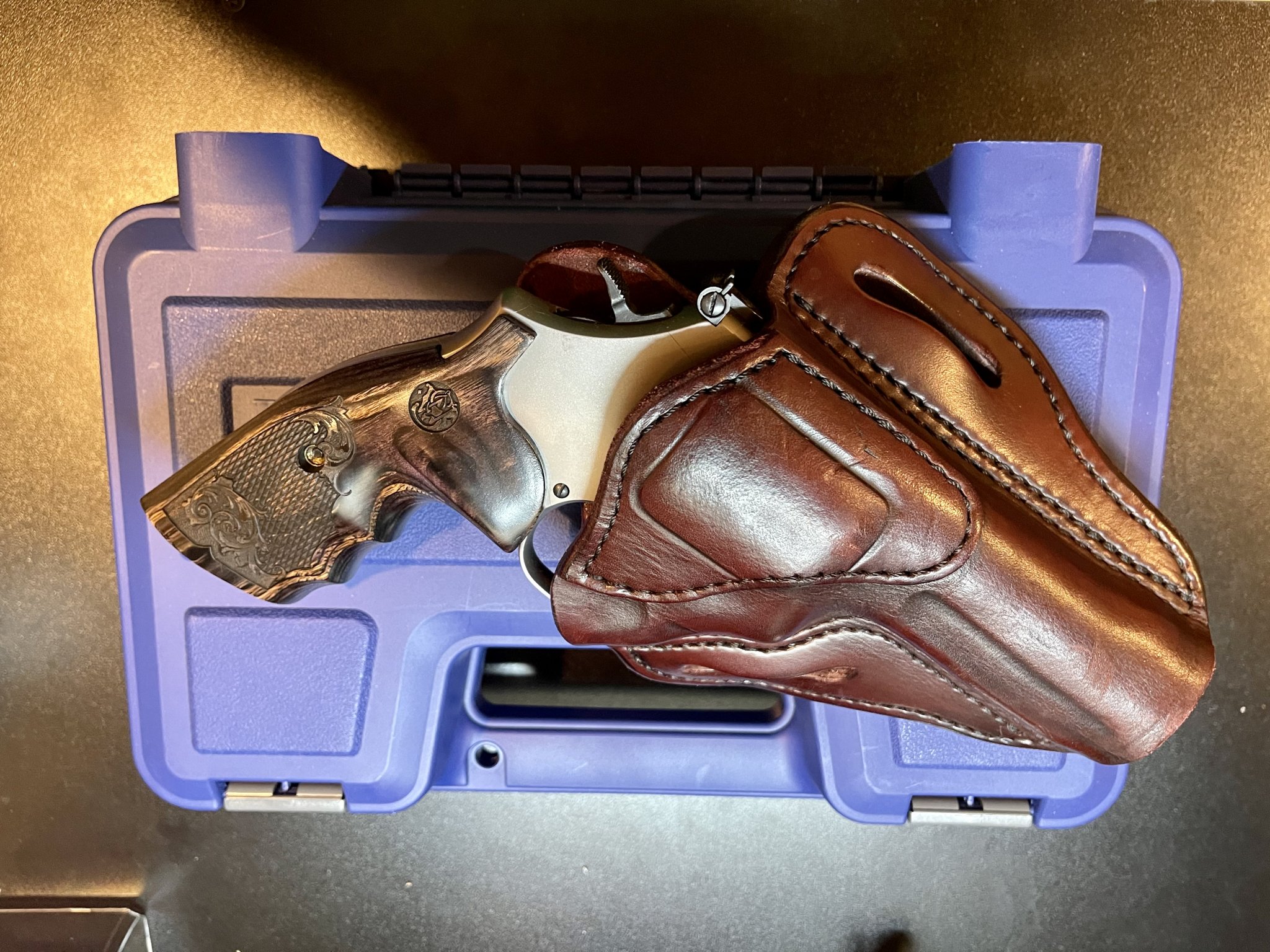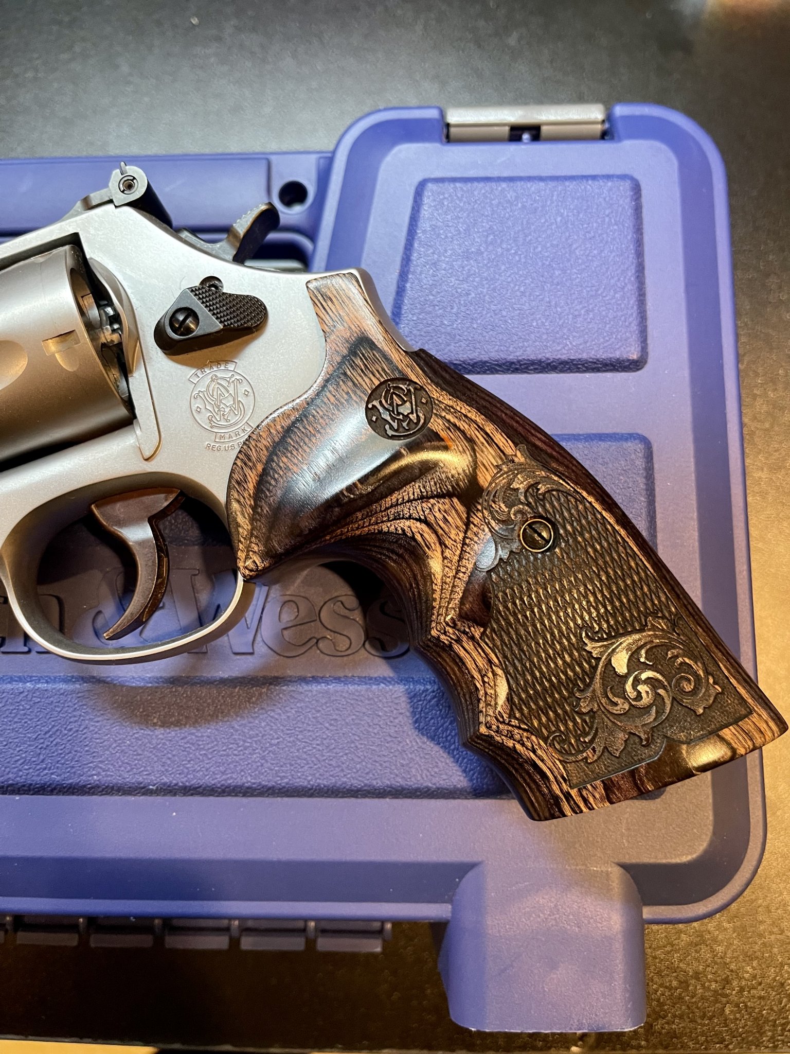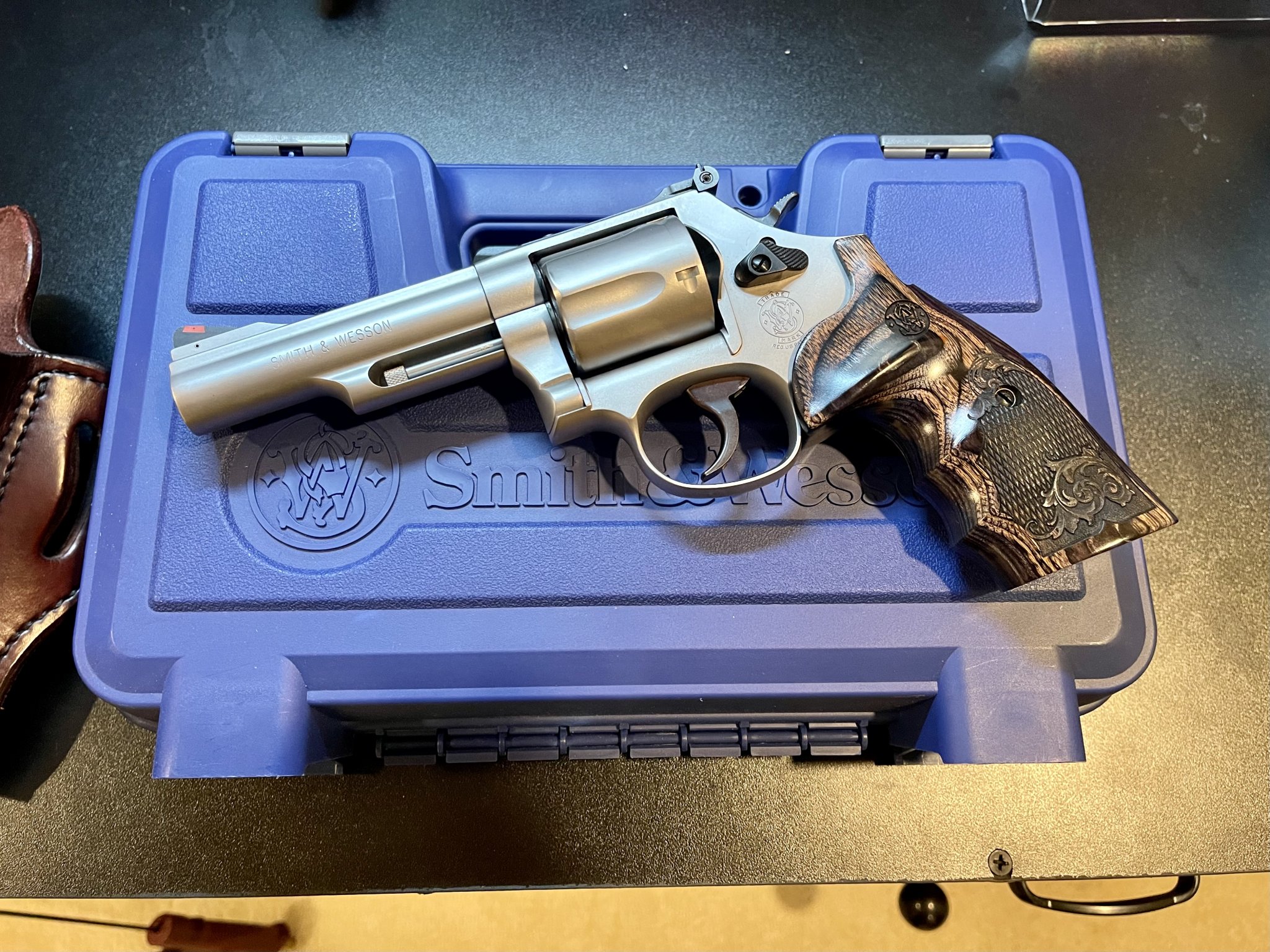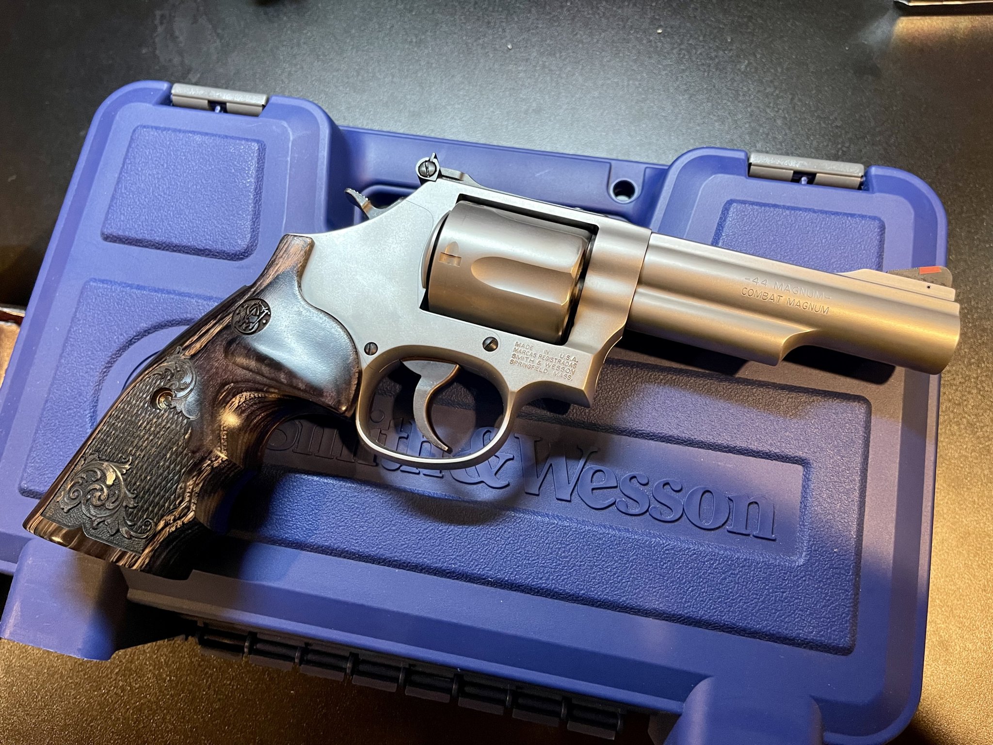 Selling off one of my safe queens to fund a new project. It’s a very well taken care of S&W model 69 “combat magnum” in 44 mag. I don’t have an exact round count, but I haven’t put more than 120 rounds through it, the majority of that being fairly light, 44 special loads. It has custom, dark colored, rosewood grips with the S&W insignia engraved in them. Also included is a leather holster and all of the original paperwork and case.