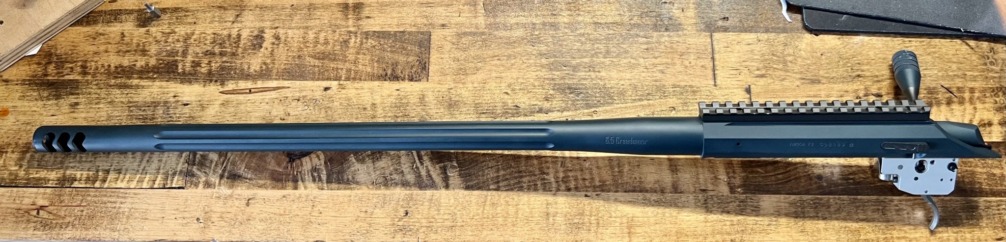 Short Action Customs built barreled action. Tikka action and tuned trigger. 20” Bartlein medium Palma with deep flutes chambered in 6.5 CM 1:8 twist. Barrel is threaded 5/8x24 and includes seamless brake. Less that 100 rounds fired.