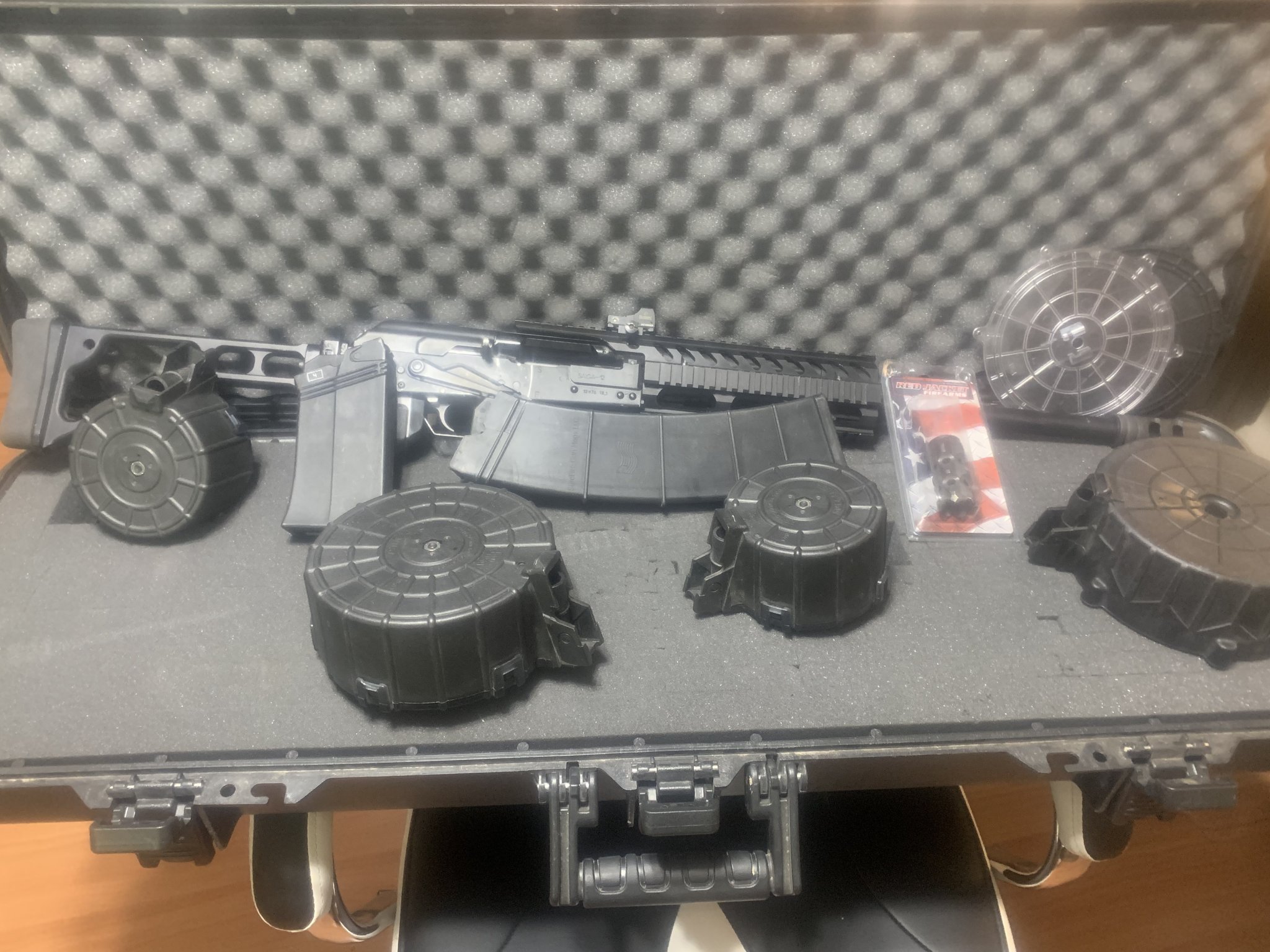 Has 2-20 round drums, 2-12 round drums, 1-10 round magazine and one 5 round magazine.