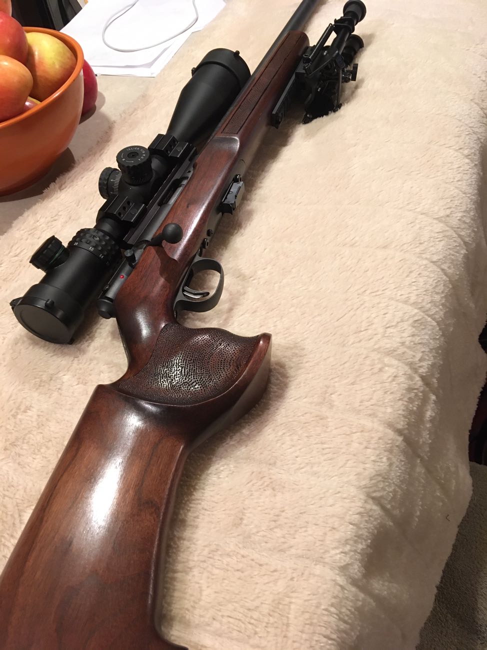 With no time to spare we laid out a stock modeled after a CZ MTR stock and started shaping, inletting, sanding and stippling the new stock. She choose a red mahogany stain color. After 2 weeks working on it off/on it was ready for the barrel/action. She did some research on Vector Optics and chose the 6-24x tactical. Great optics BTW. Eye relief can be finicky but glass is very clear and returns to zero every time.