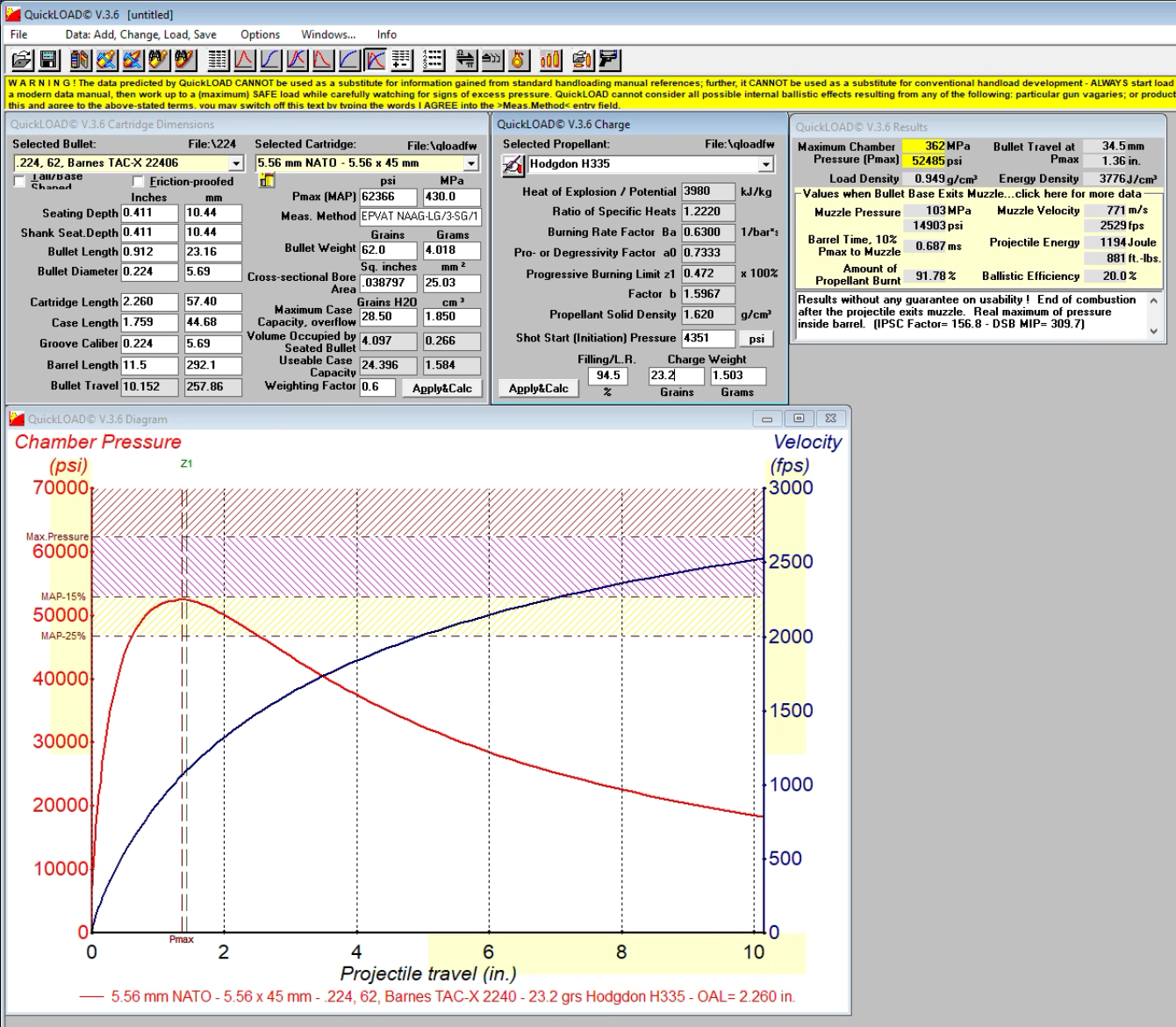 essentially the reason I listed H335, is I punched in desired bullet and seating depth (via coal), barrel length, constrained to minimum 70% fill and Pmax -13%, then sorted for max velocity on the powder table. H335 is as fast as you’re going to get unless you start playing in the pmax -5% zone after fully characterizing a specific powder lot. (I’ve only done this with my batch of CFE223 where several dozen rounds in controlled conditions gave me a reading that it tends to run slightly hot by about 2%)