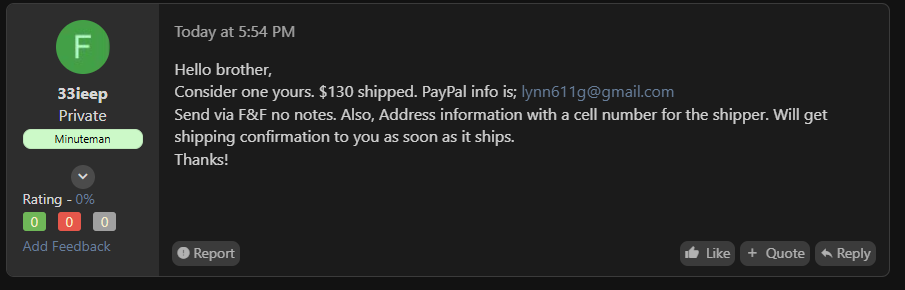 This jackass has messaged at least two members attempting to get payment for items listed by other members and he was engaged in conversation with someone just a minute ago, so BEWARE!