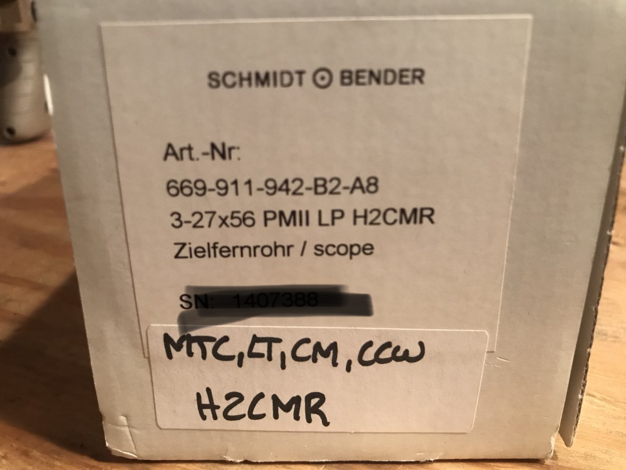 SOLD:Next up is a S&B 3-27 with locking mtc turrets. Reticle is also H2cmr. Will come with tenebrax lens caps and original box. Does not include spuhr mount, but could be sold with. This scope is also in excellent condition. Glass is perfect. Price is $old. Insurance is on the buyer. Please feel free to ask any questions. Thanks.