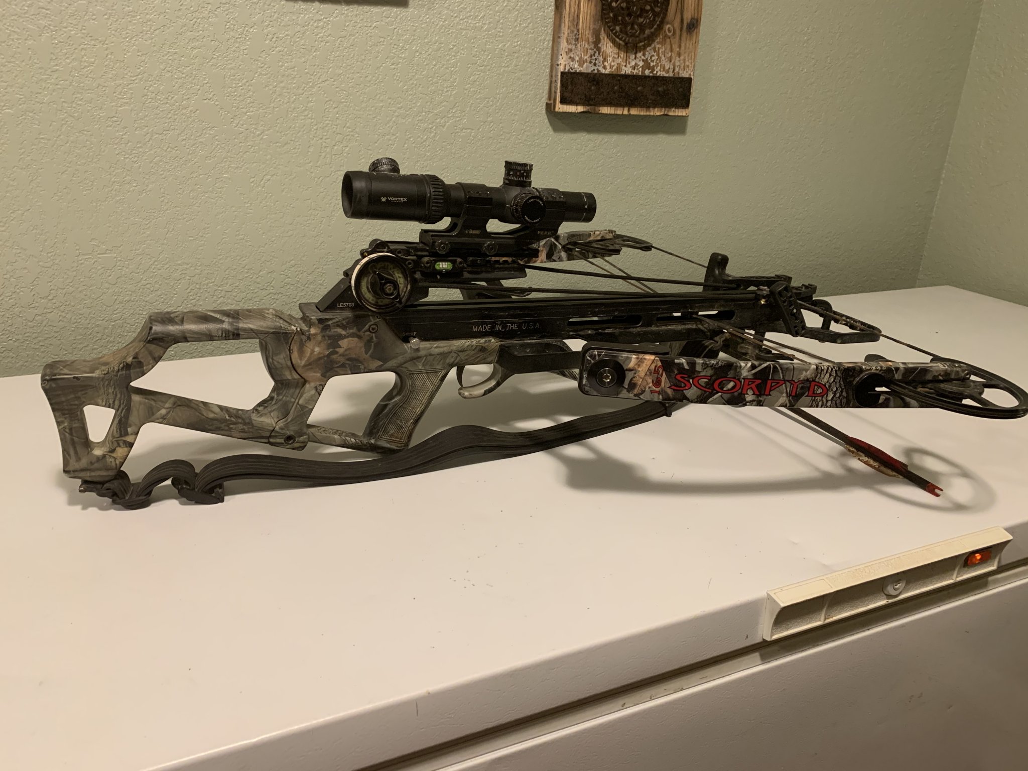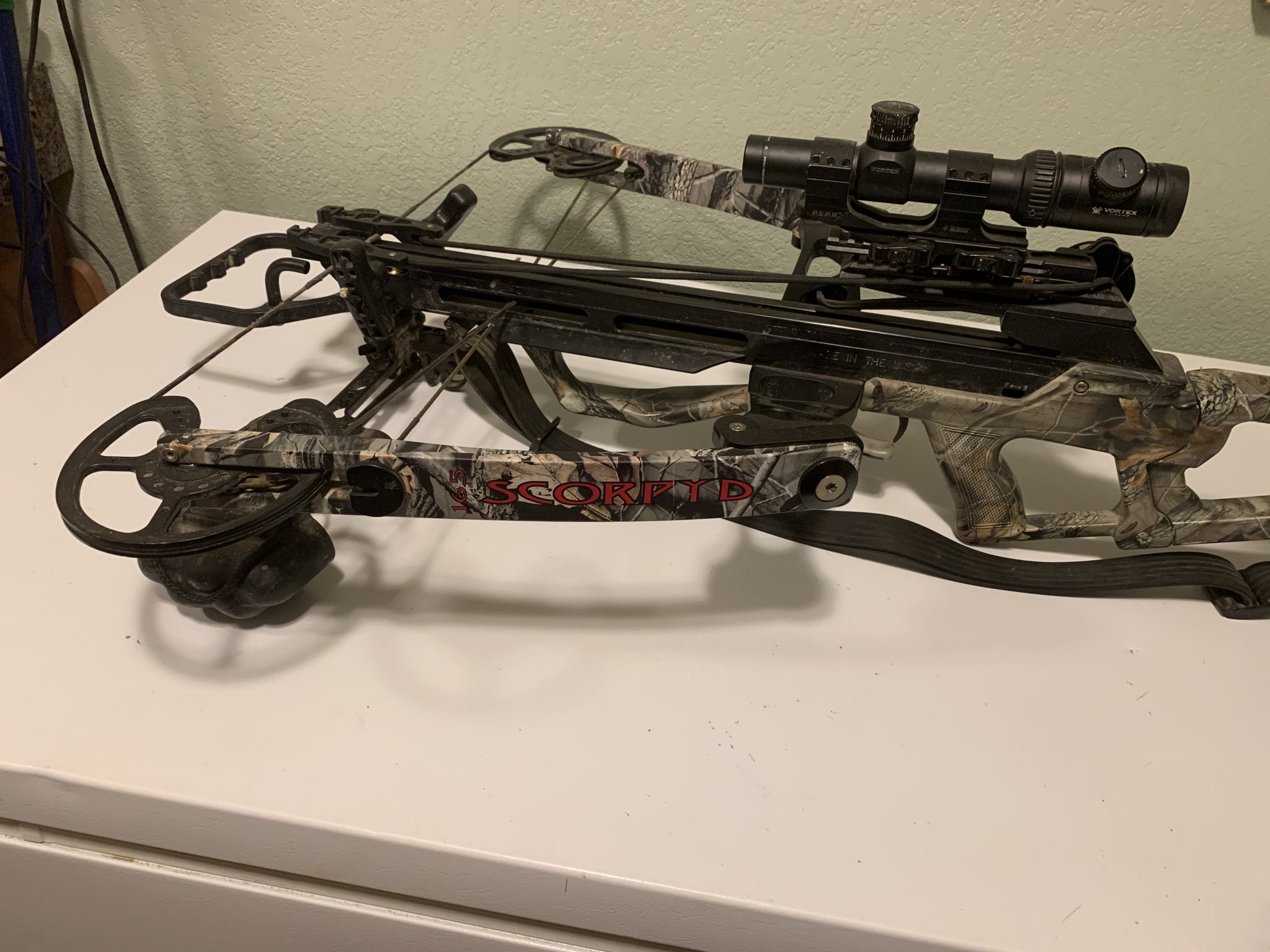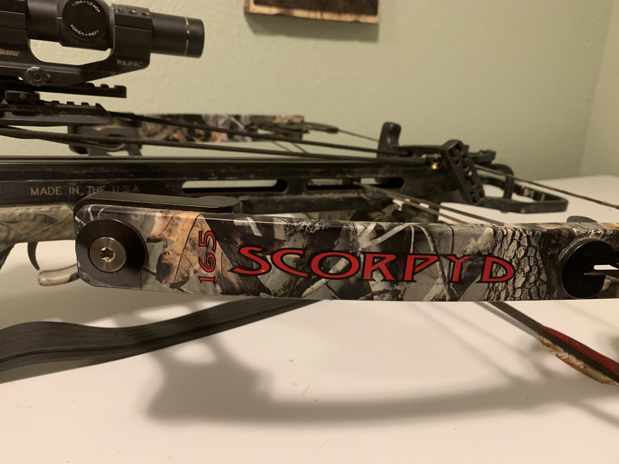 Scorpyd Vtec crossbow for sale. Has the 165lb limbs. String is in fair shape. Has been hunted with. Comes with the hha optimizer also. Comes with the cocker and the quiver and 5 spinal tapp 26.5” .001 boltas also. This thing is blazing fast and shoots incredible. Asking 1k shipped