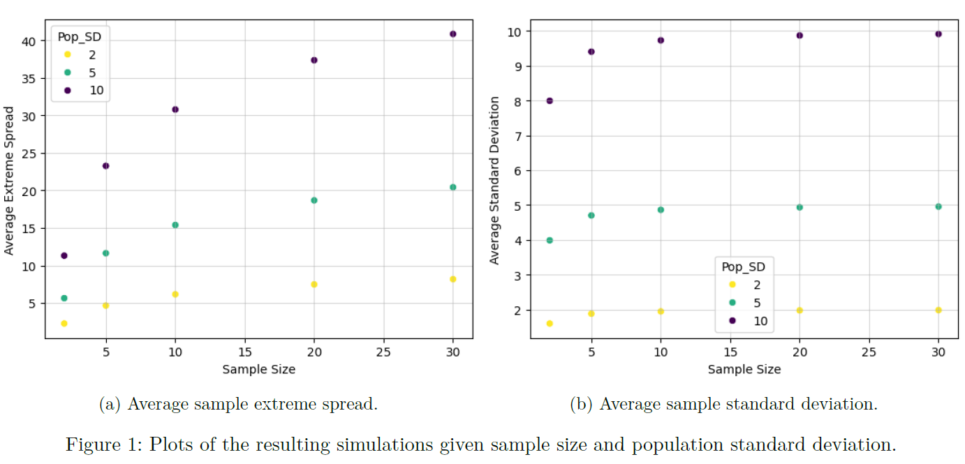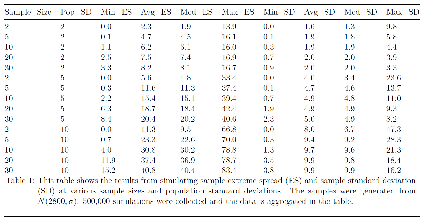 I wanted to comment on the behavior of sample ES at small sample sizes. It suffers the same consequence as sample SD. As can be seen below, sample ES can be underestimated much like sample SD when the sample size is small. Depending on the population SD, convergence onto the population value can be as small as 10 observations or as high as 30 observations. Since you do not know the population standard deviation, you have no idea how underestimated the statistic might be. Worse, the plots below show “on-average” results. No one is testing their rifle 500k times just to estimate a statistic. The minimums and maximums in the table illustrate how disperse any one test could be. As one would expect, more observations shrink the range between the minimum and maximum.