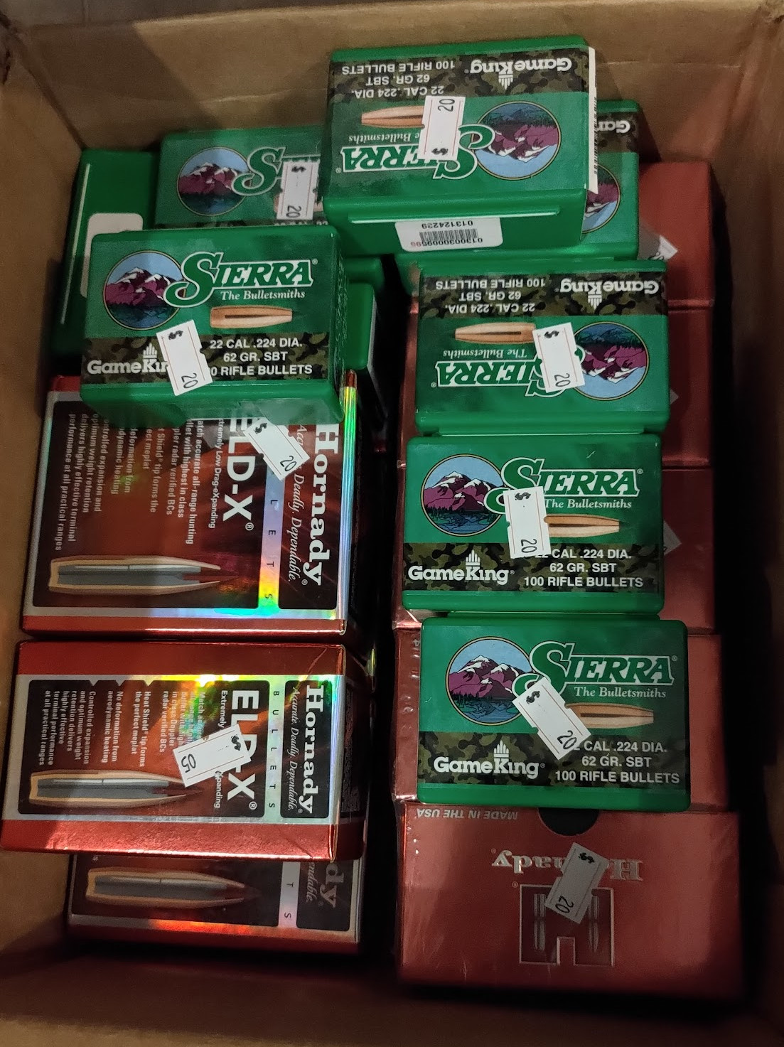 $20/box of ELD-X .30 cal (500+ 178gn, a couple hundred 200gn+), Sierra GameKing .22 cal (500).