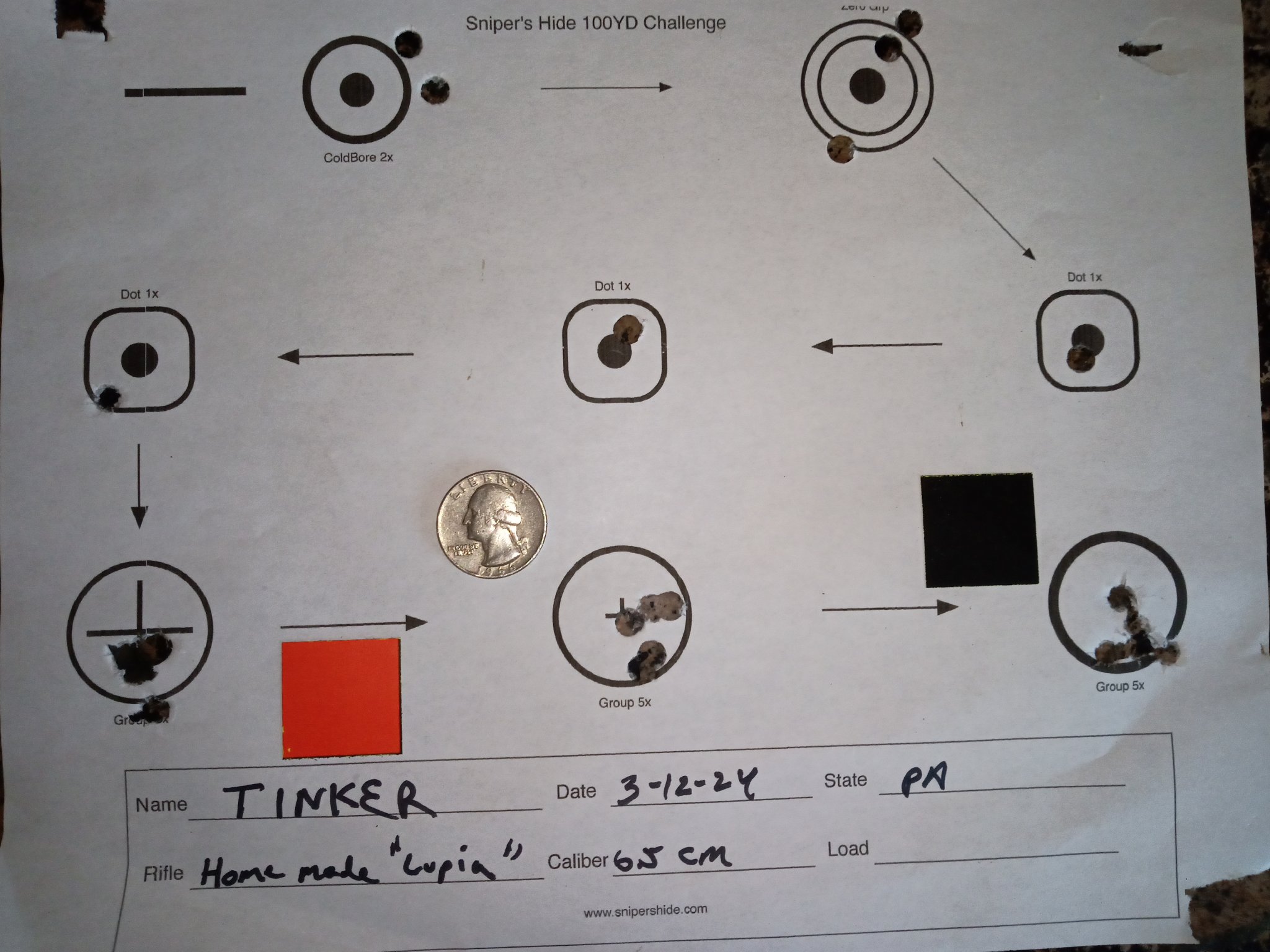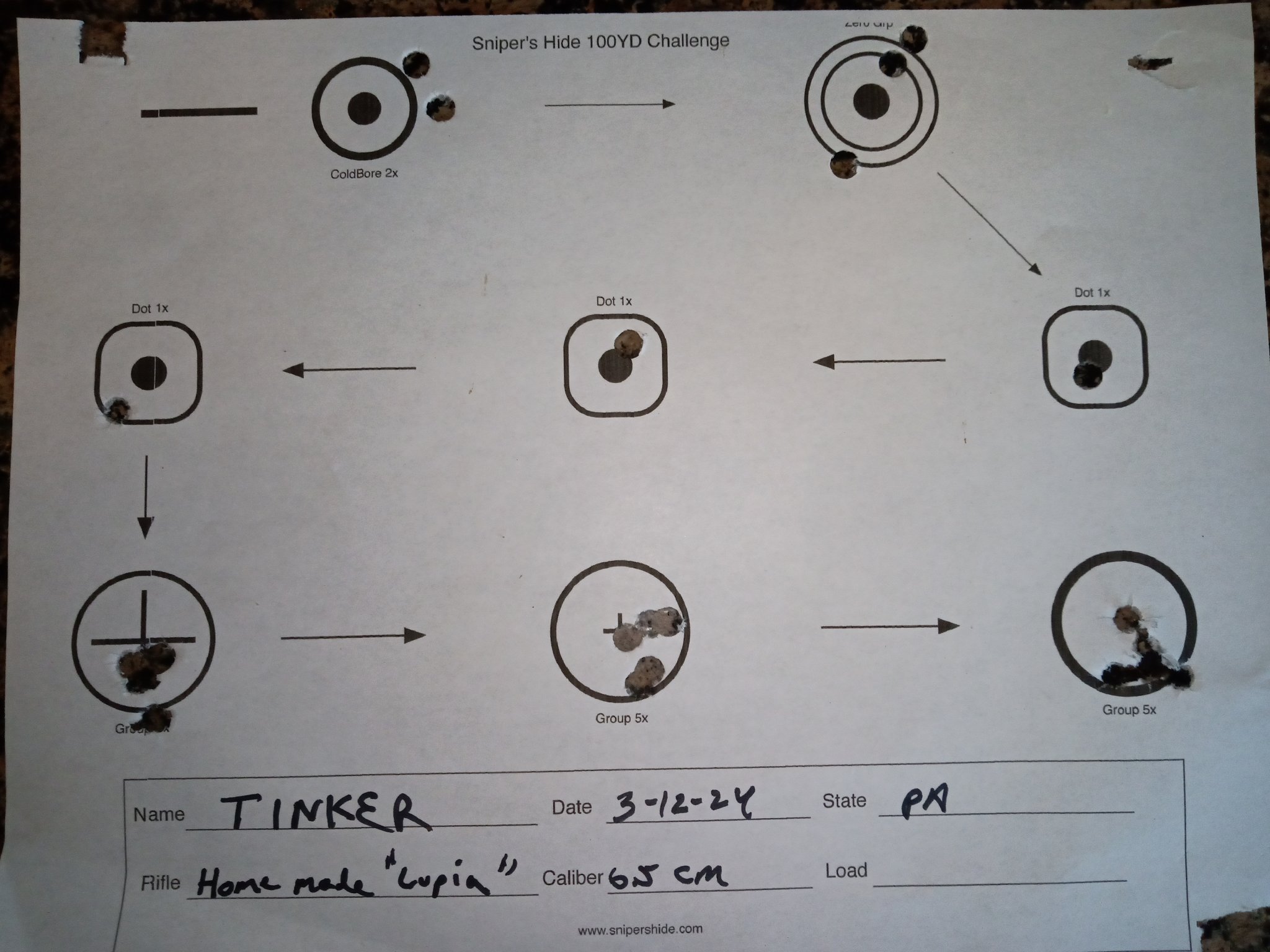Used my Tikka CTR in an XLR stock. US Optic scope at 17x. Prime 6.5CM ammo. Bipod up front and small rear bag. Will definitely try again as I dropped 2 on the cold bore (1 touching the dot, the second just outside the circle and 2 more on the second dot). Maybe with some practice I can get in the high 4's or low 5's, but not going to be on the leader board anytime soon.
