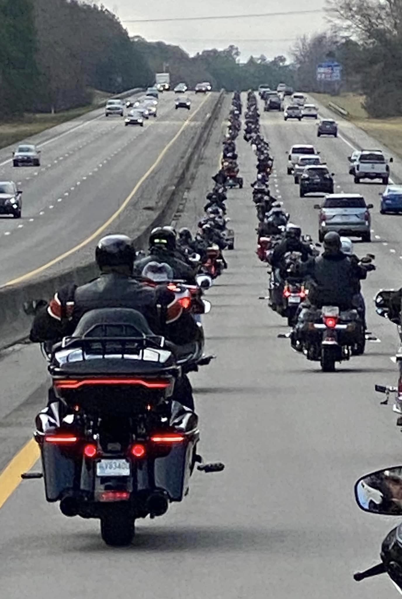 The last big ride we did was our annual Polar Bear run to Georgia in January. (I think I posted it a few pages back) This big 'ol line wasn't the worst I've ridden in--our local Toys for Tots run has that trophy--but it wasn't a lot of fun. Most of the folks were fine, but there were just too many newbies and with around 80-100 bikes, there was just too much potential for problems. (My girlfriend took this pic while we were in the middle of the pack) After about 4 miles, we took an offramp and took up a tailgunner position after they had all passed.View attachment 8116517