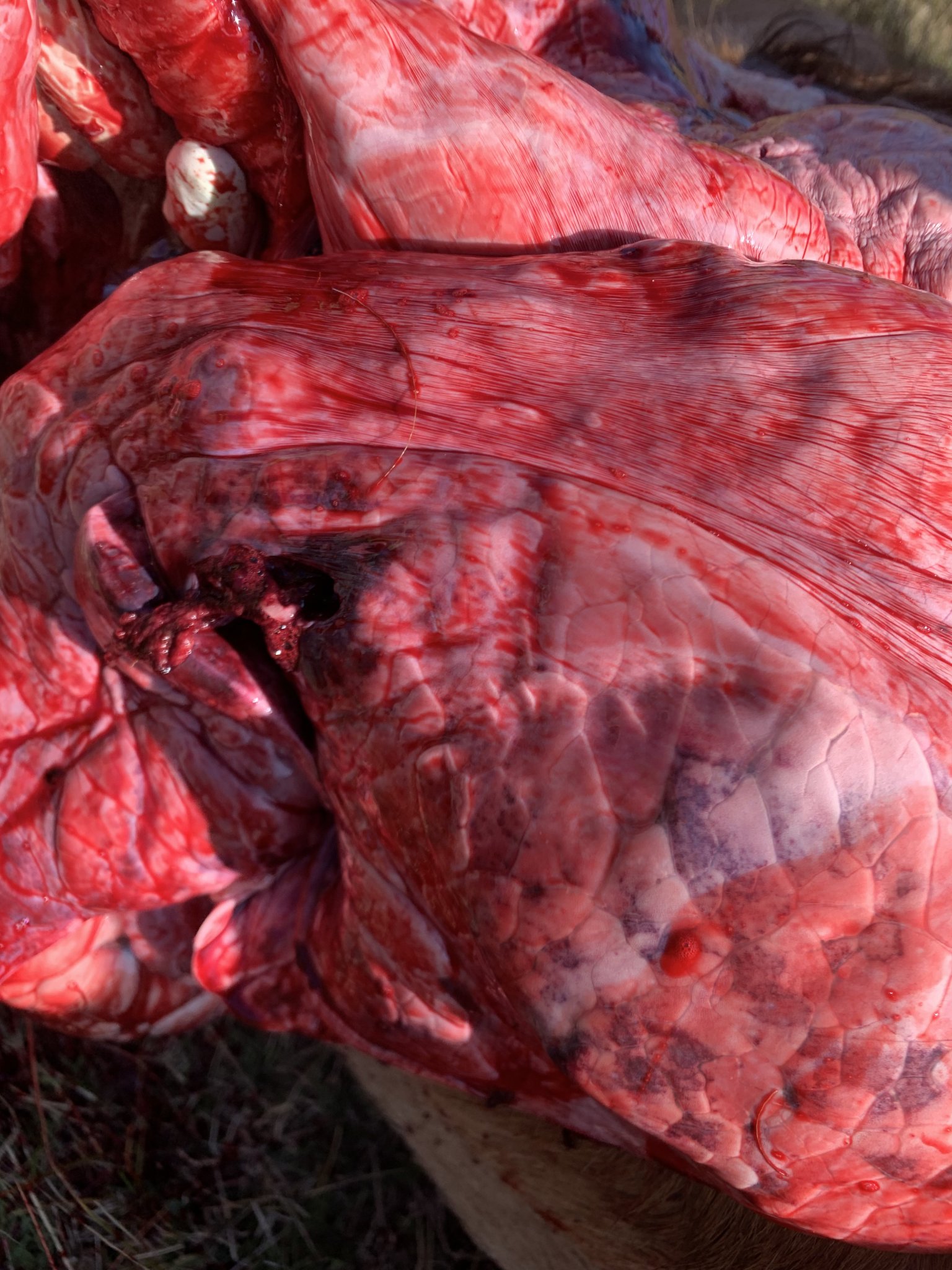 If you go thru and thru both lungs, each lung perforated twice (4 times), and especially twice to outside air pressure, the animal cannot take one more single breath. The outside wounds become sucking wounds, in other words, the lungs can't inflate any more. There is a LOT of information on this, mostly on humans, believe it or not.