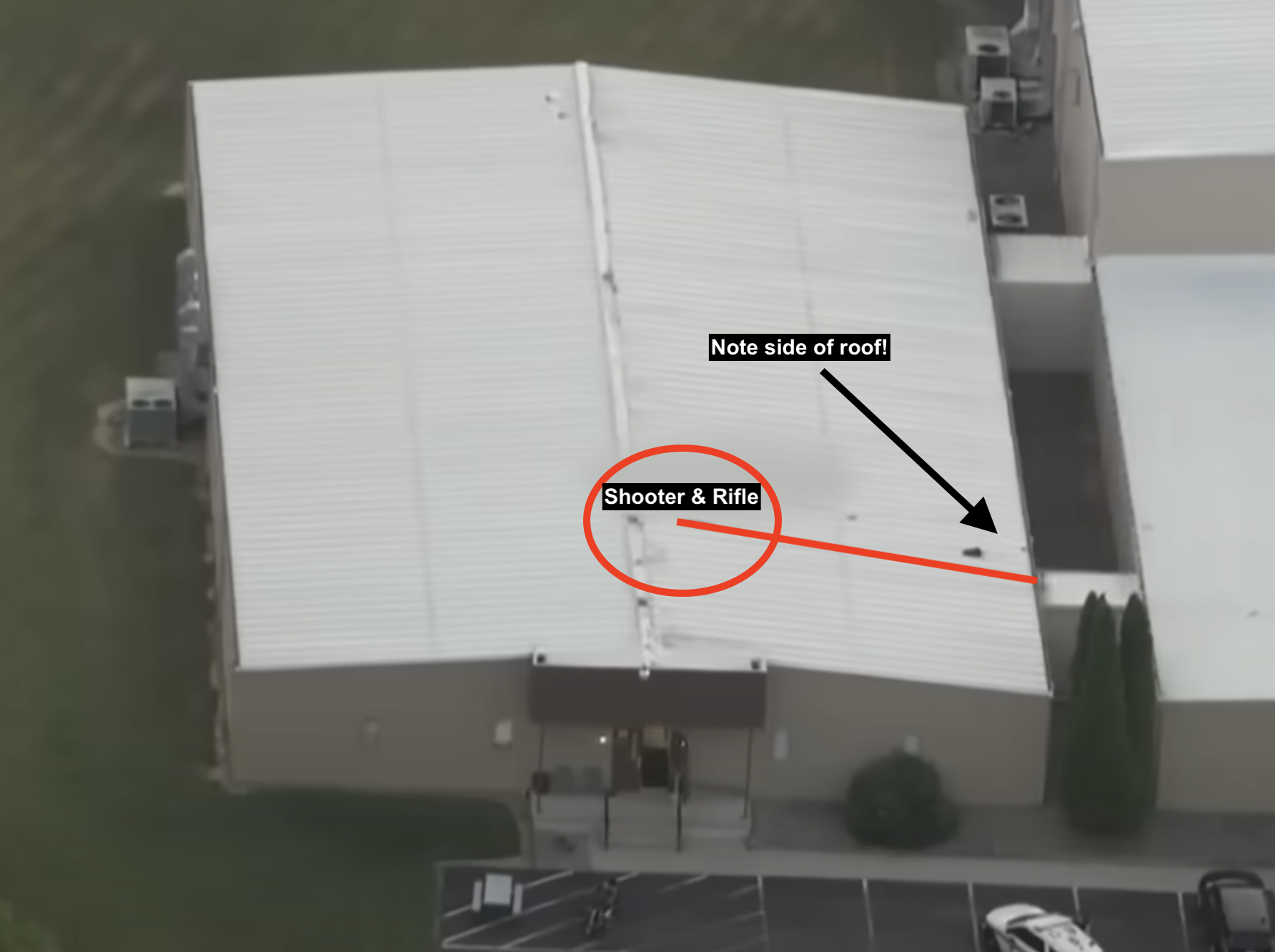 BS. Stop giving them excuses. Any viable shooting positions should've been identified prior to the rally. If anything, it is more worrisome is that the shooter knew to go exactly to this position - how did he know to do that? Do you think that was random? I highly doubt this 20 y.o. without a military or tactical background could do this on his own. Think about that. And the video from his truck more worrisome. Come on man.The CS team we've seen videos and pictures of had their line of sight clearly blocked by a tree. Several versions of this have placed the CS team on the wrong roof and the shooter on the wrong side of the roof. See 3D renders below for accurate placement.
