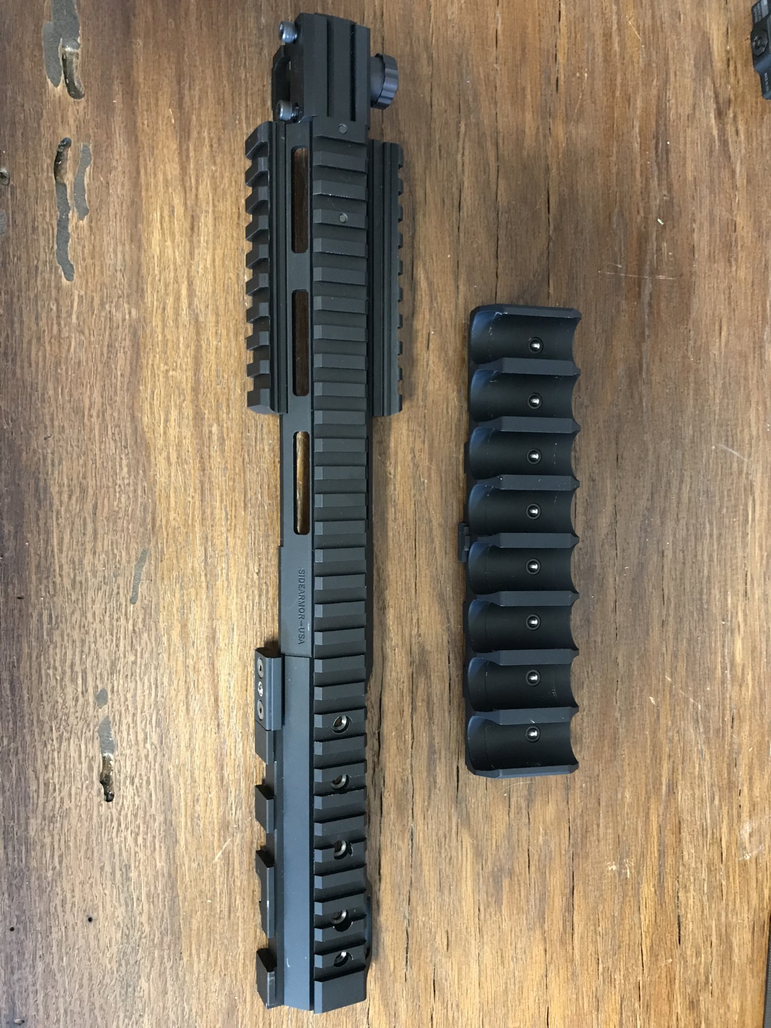 This is an original SideArmor rail system for the Benelli M4 Shotgun. The original owners of SideArmor sold the holster portion of the company (along with the name); they kept the rails, but had to rename and now go by Asgard Defense Systems.