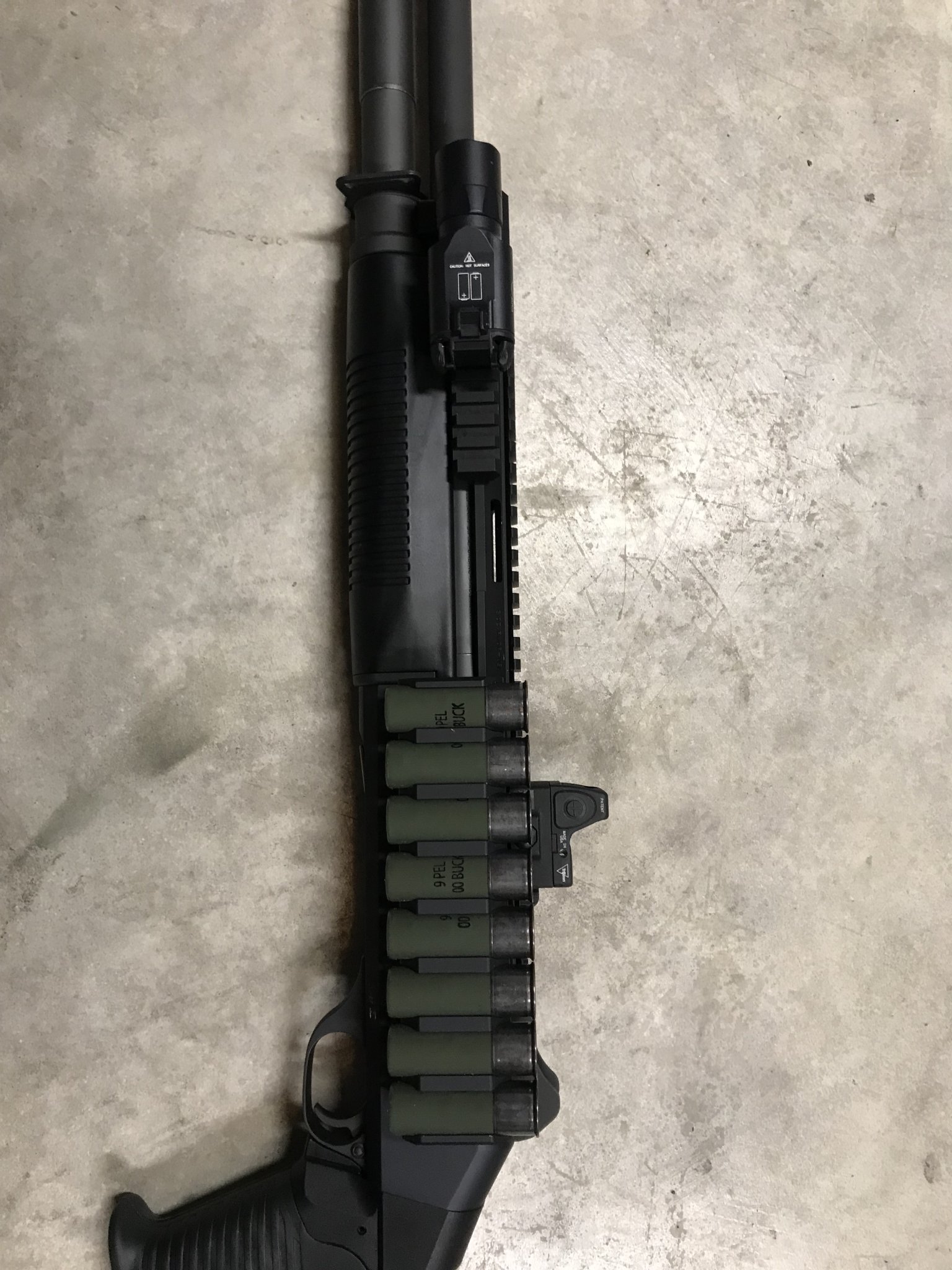 This is a great system that gives you a full length upper rail for mounting optics and rail sections at 3 & 9 for mounting a weapon light, etc, while still allowing plenty of room to grip the forend. The detachable shell carrier is aluminum with ball bearings, so it won't fatigue like plastic (the shells don't need to be removed on a regular basis). Sale includes 8-shot shell holder which is a quick detach that is very easy to remove and install with or without shells in it.