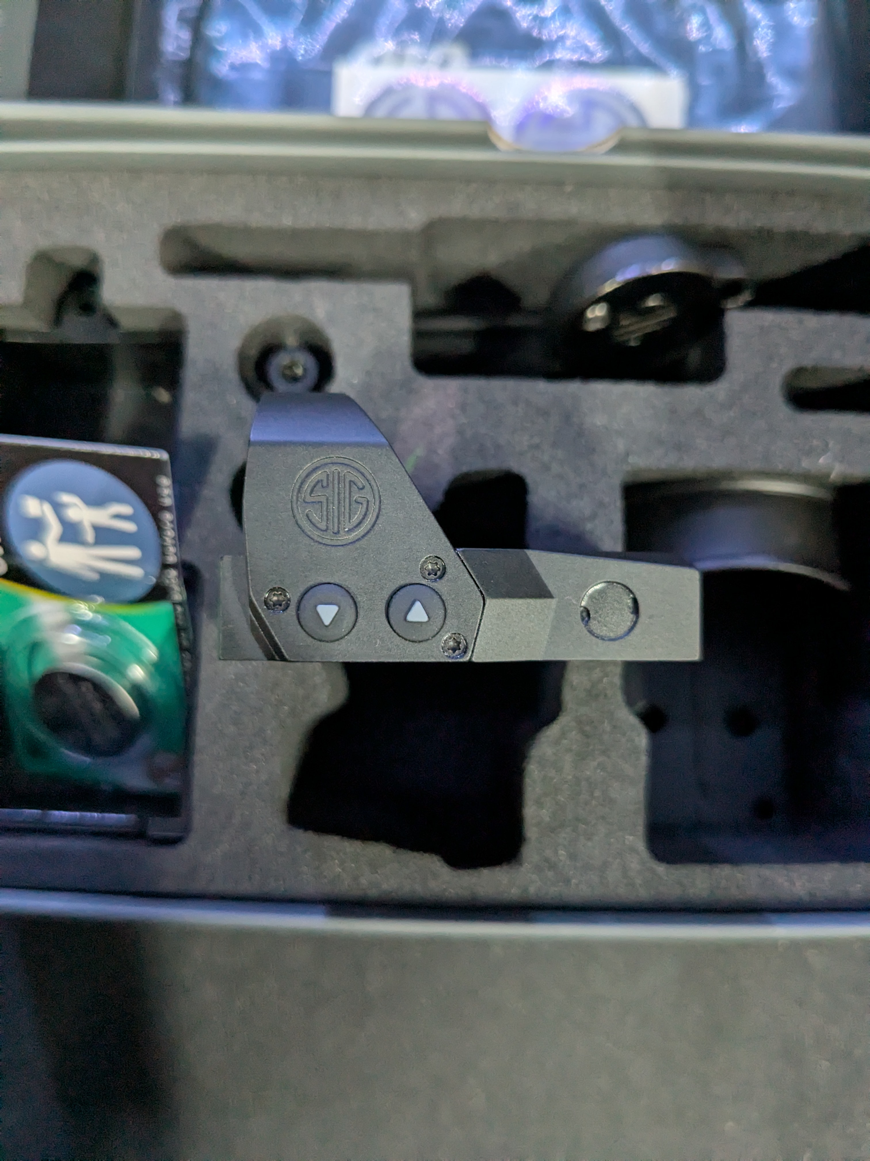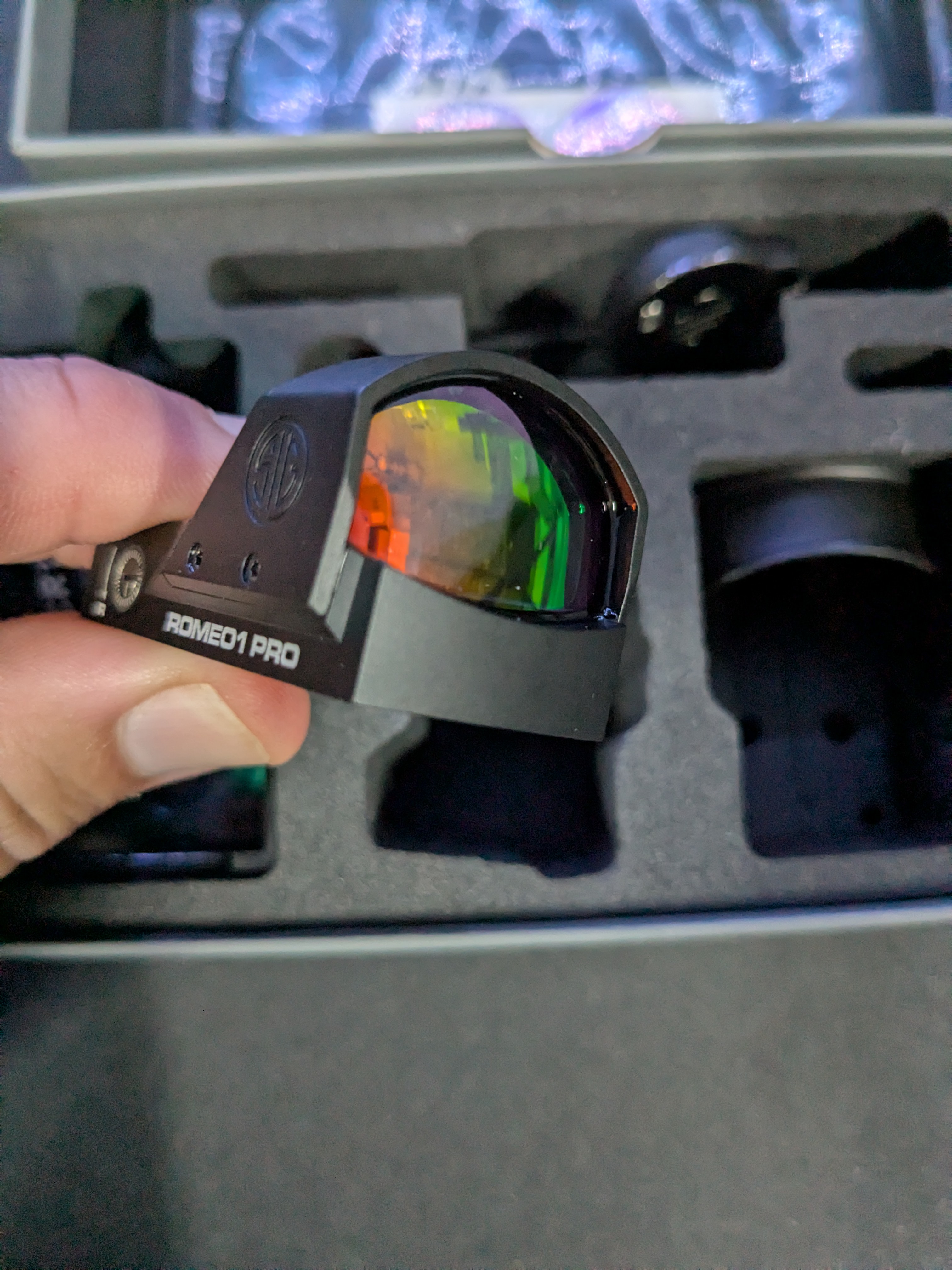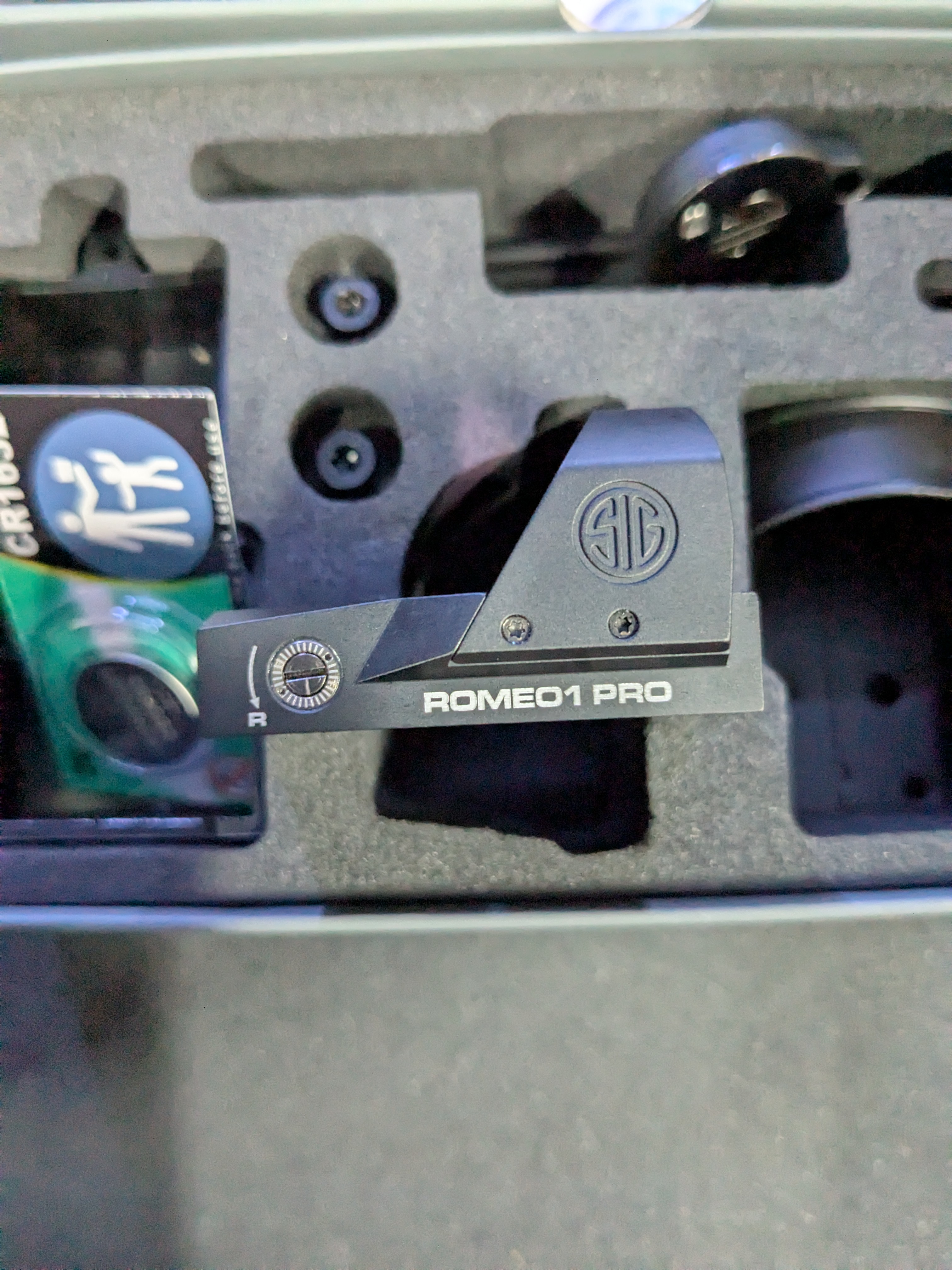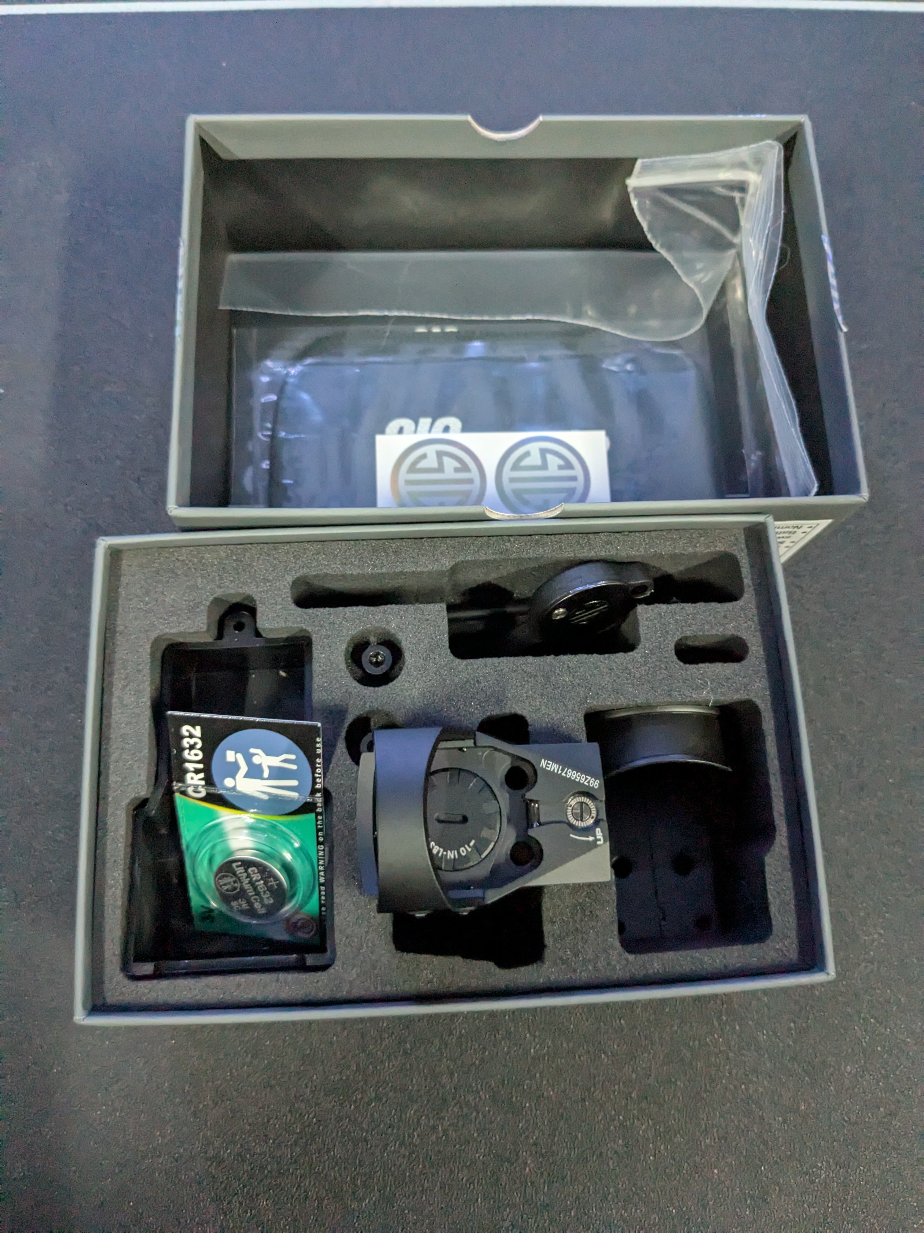 New Sig Sauer Romeo 1 Pro (6 MOA) only opened for pictures. All contents includes in the box battery, shroud, optics cover, manuals, and lens cloth.